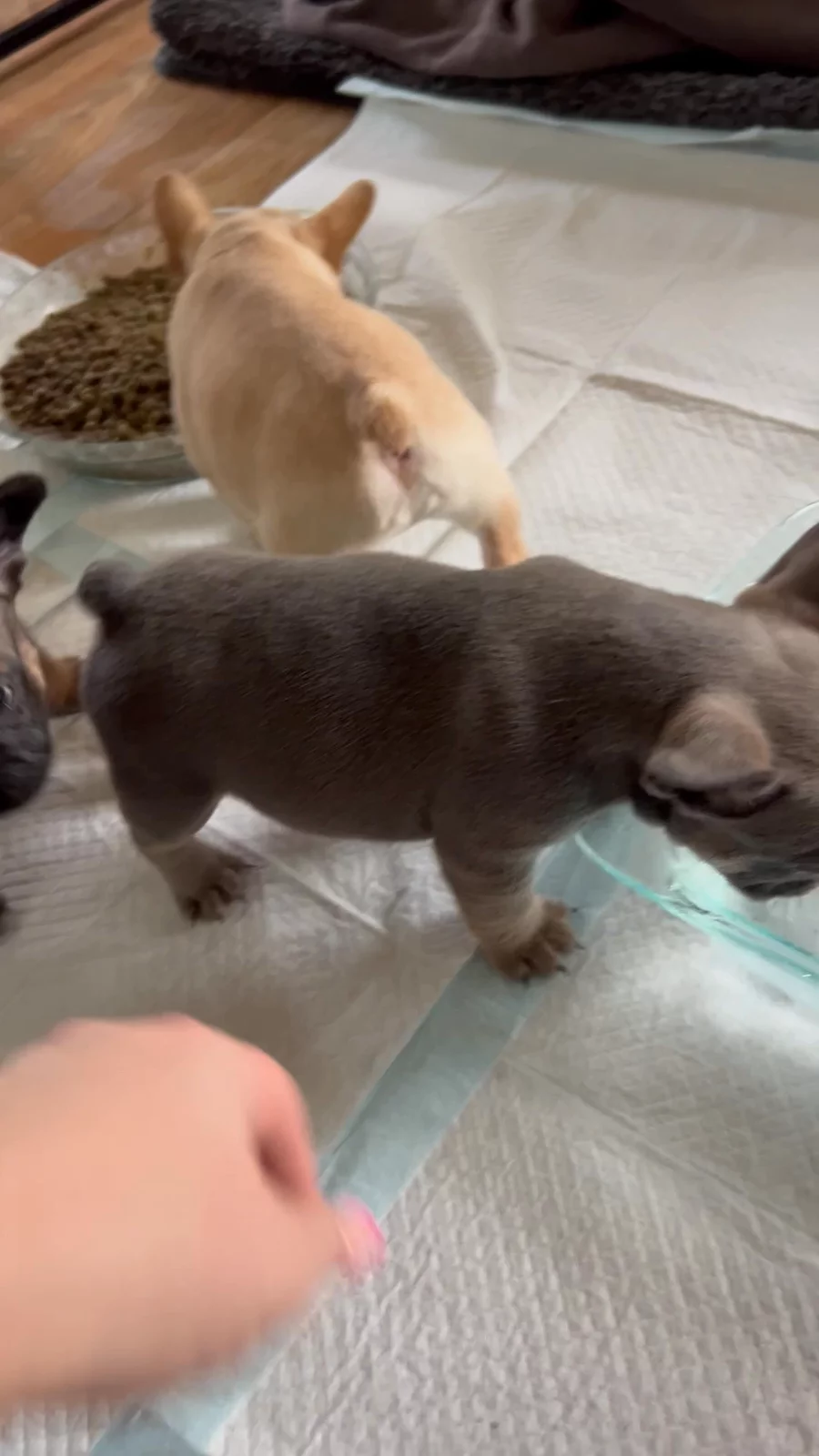 They are fully weaned from Mom and eating and drinking on their own and beginning to potty train onto grass mat and pee pad