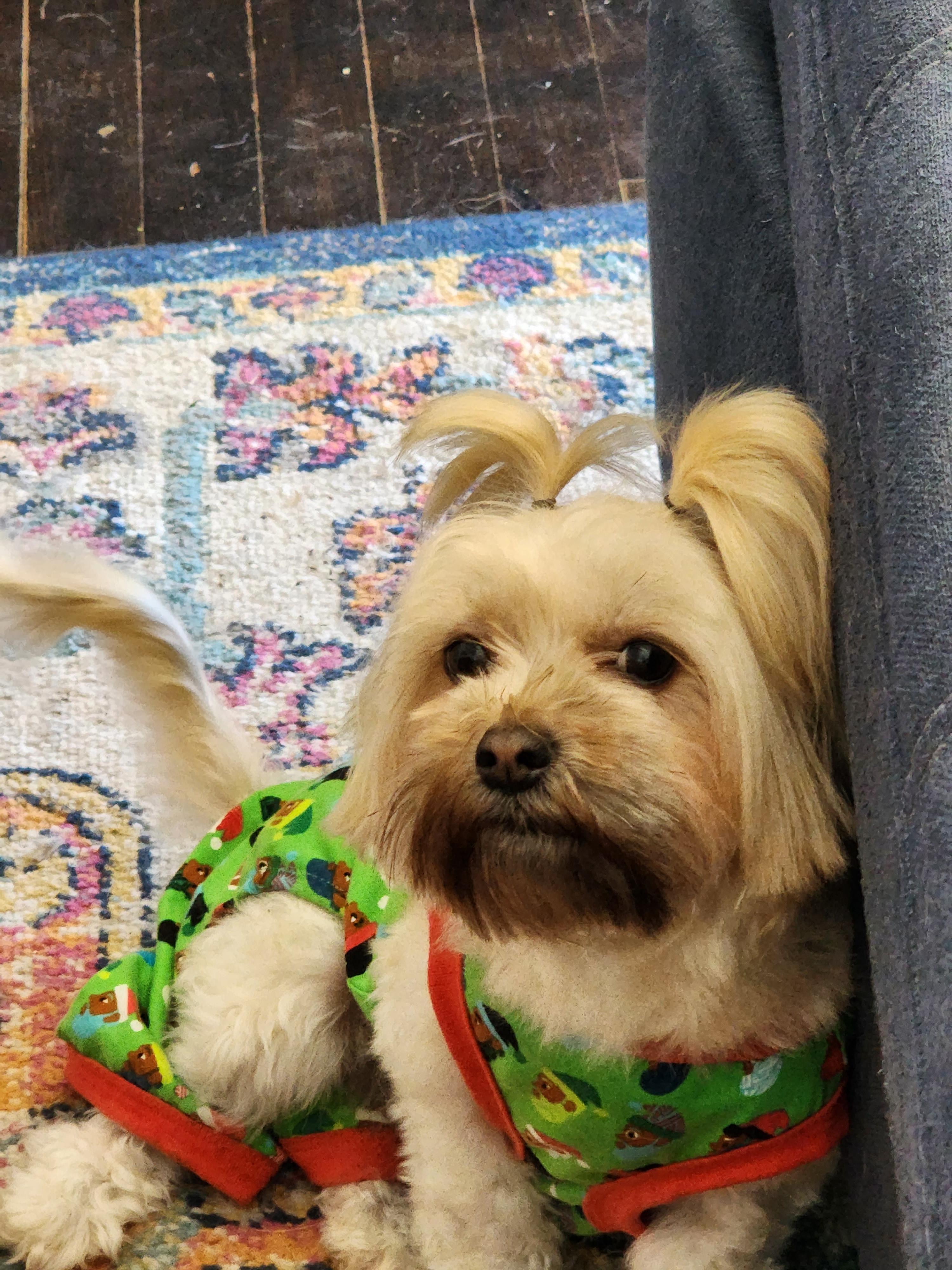 Yorkie poodle mix dog. Mama by nature, loving nuruting and playful with her liter.