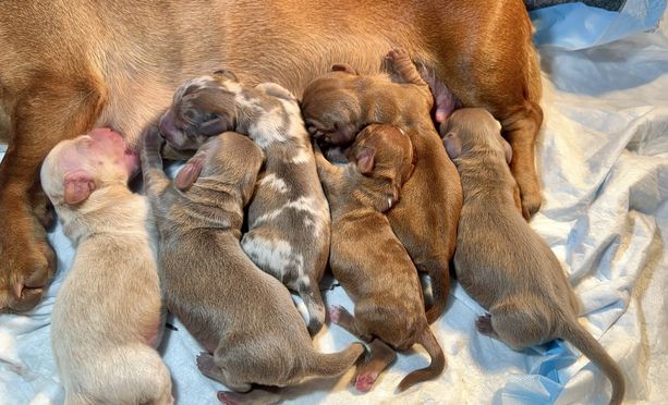 Our puppies include red, blue and tan, chocolate and cream, fawn (isabella) and cream, and dapple. Colors will vary depending on the parent dogs.