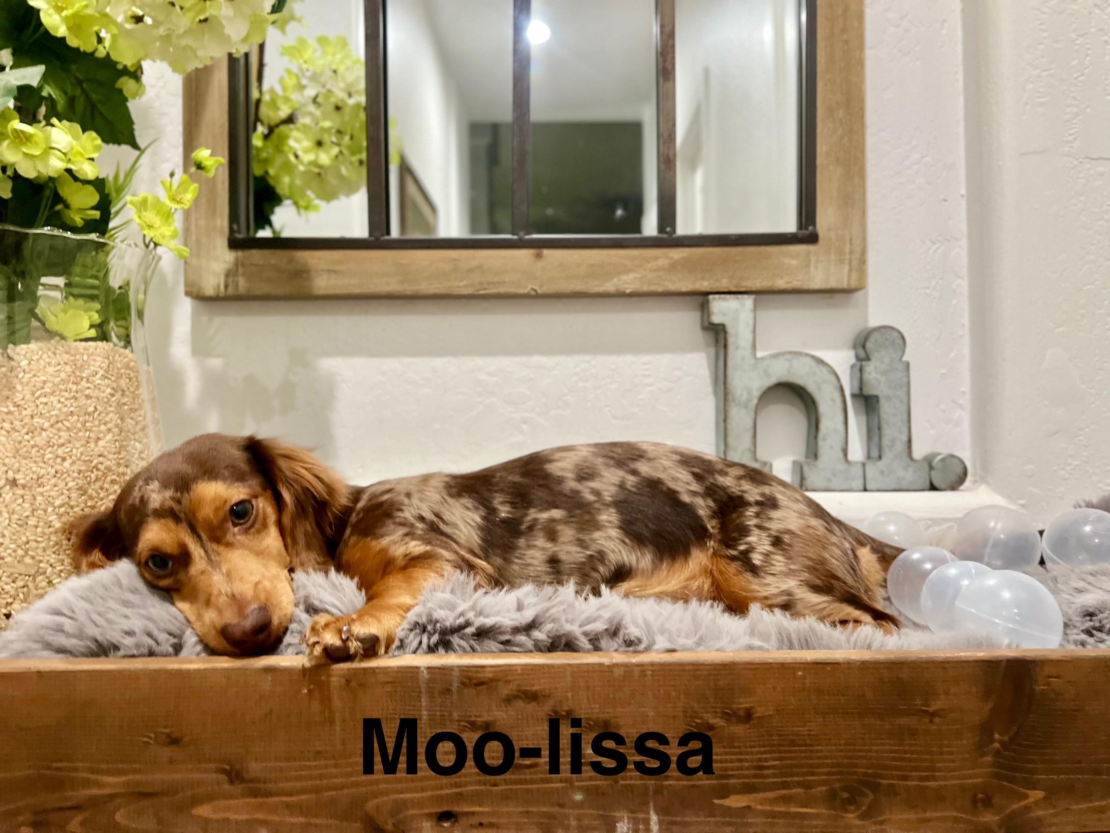 Moo-Moo is a female Dachshund. Carefully selected as a great representative of her breed, Heather decided to make her part of their program. Heather has passed Good Dog’s screening process, which involved a review of their breeding practices, environment, and the mental and physical health of their dogs.
