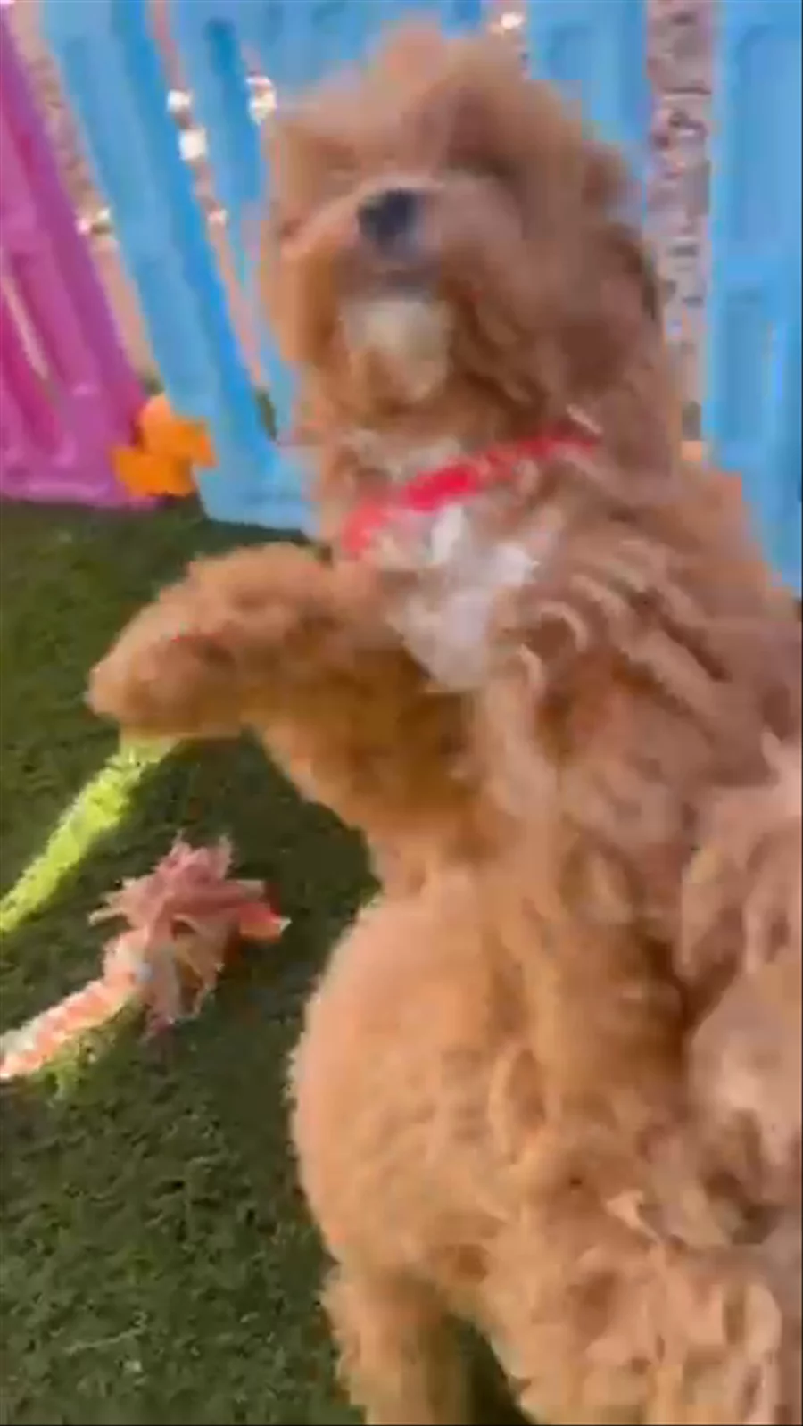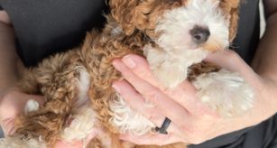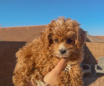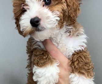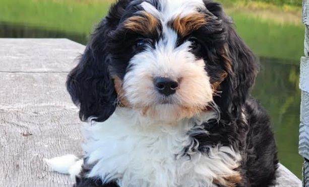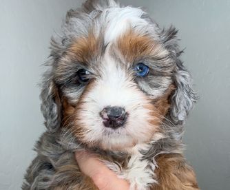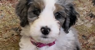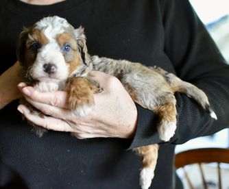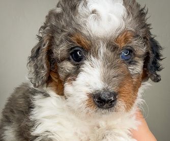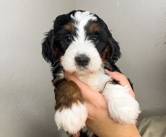 Our Cavapoo puppies are red. Bernedoodle puppies include tri-color and merle. Colors will vary depending on the parent dogs.