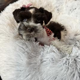 Jessica and her B4 Breeding facility are simply the BEST! From my first communication with her and throughout the weeks leading to our pick up of my precious Lizzie May, Jessica has been in touch with me with photos and answers to all my inquiries. I visited the breeding facilities at her home when my pup was 5 weeks old and was so impressed with the quality, safety and cleanliness of all the surroundings. This is a true family operation focused on raising well bred, healthy pups By the time that my pup was weaned and ready to bring to our home, she had been well socialized and has a great personality. I am so grateful to have found Jessica and her quality bloodlines. The perfect match for my search for a female Parti Toy Schnauzer 😍
