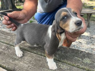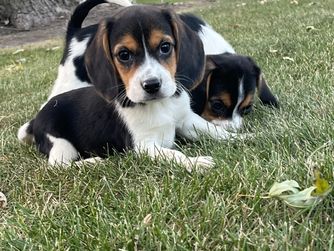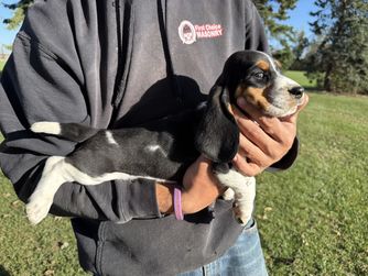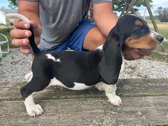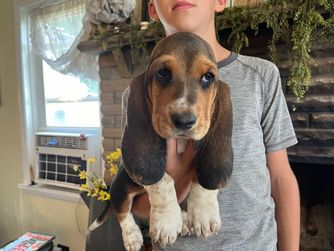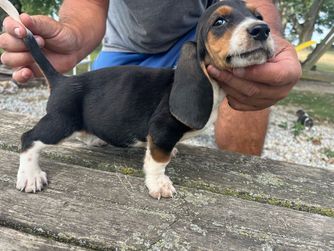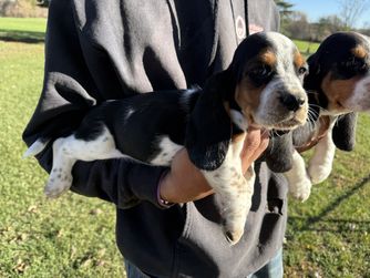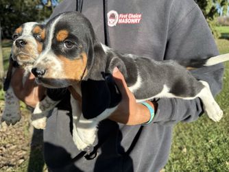 Our Basset Hound puppies include black white and tan and black tan and white. Beagle puppies include brown and white, red and white, black and tan, and black tan and white. Colors will vary depending on the parent dogs.