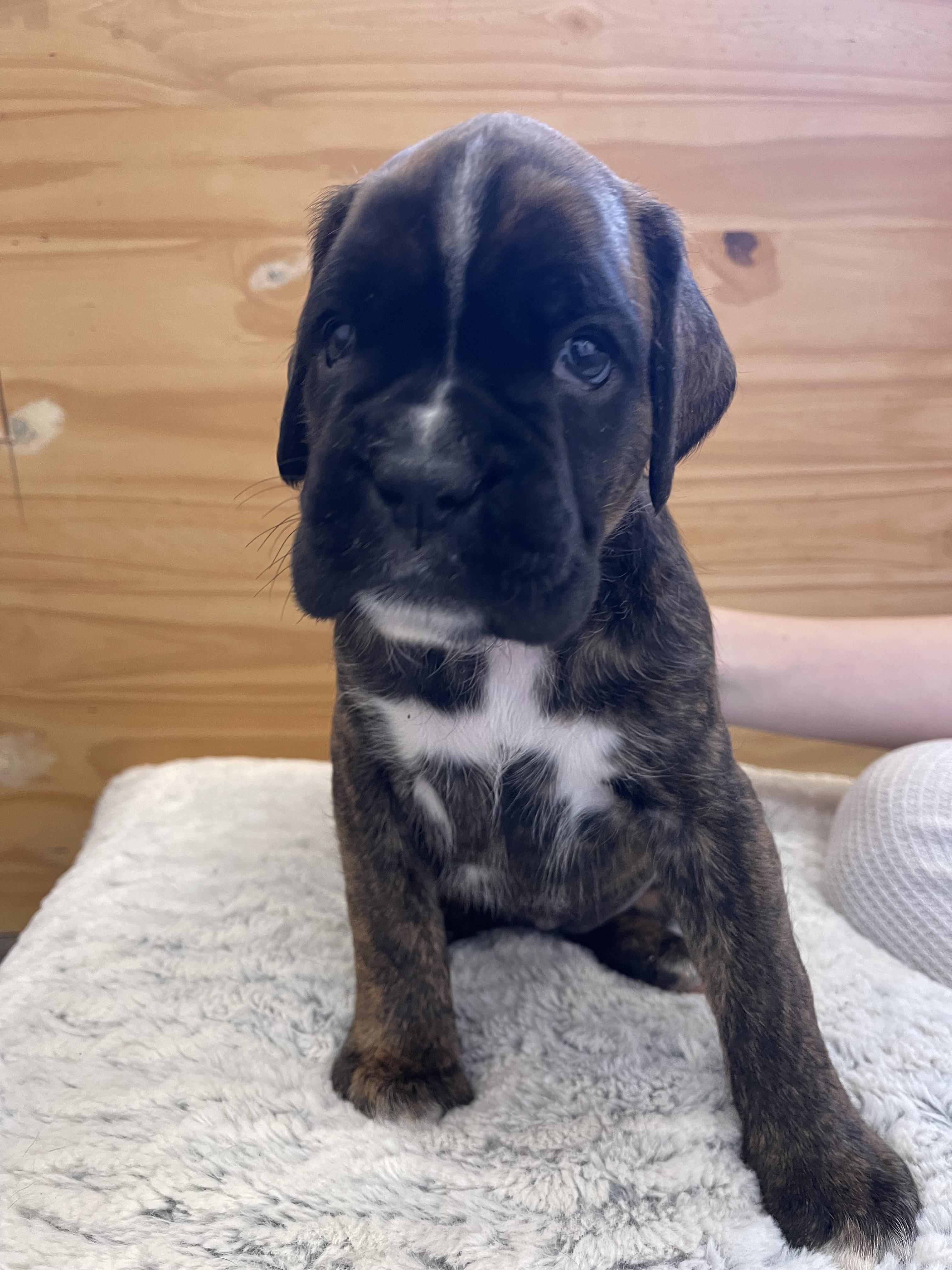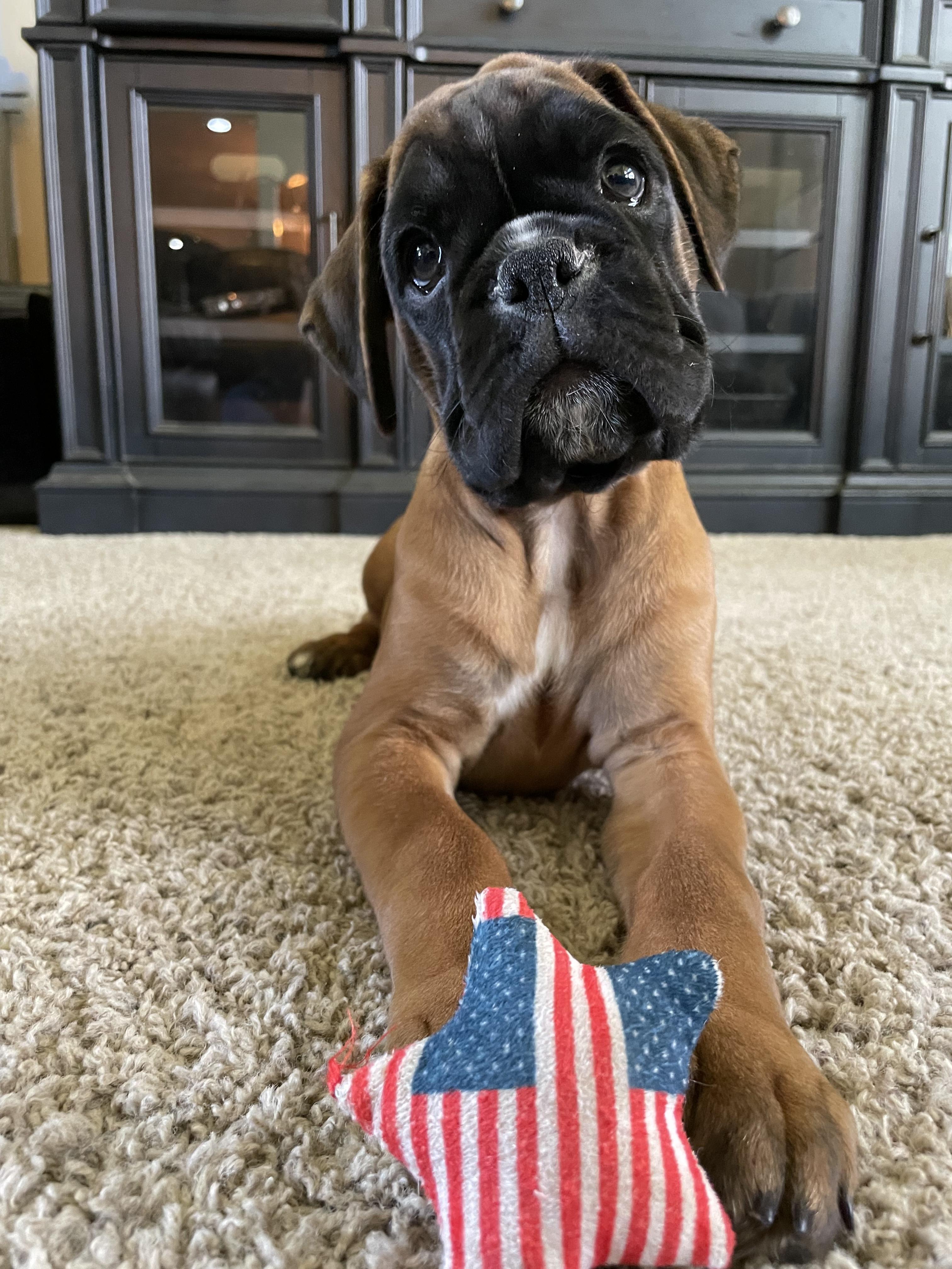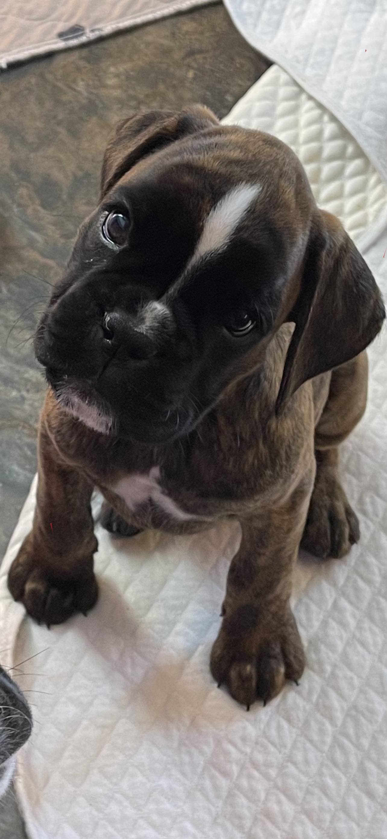 Finley is a female Boxer. Carefully selected as a great representative of her breed, Rachel decided to make her part of their program. Rachel has passed Good Dog’s screening process, which involved a review of their breeding practices, environment, and the mental and physical health of their dogs.