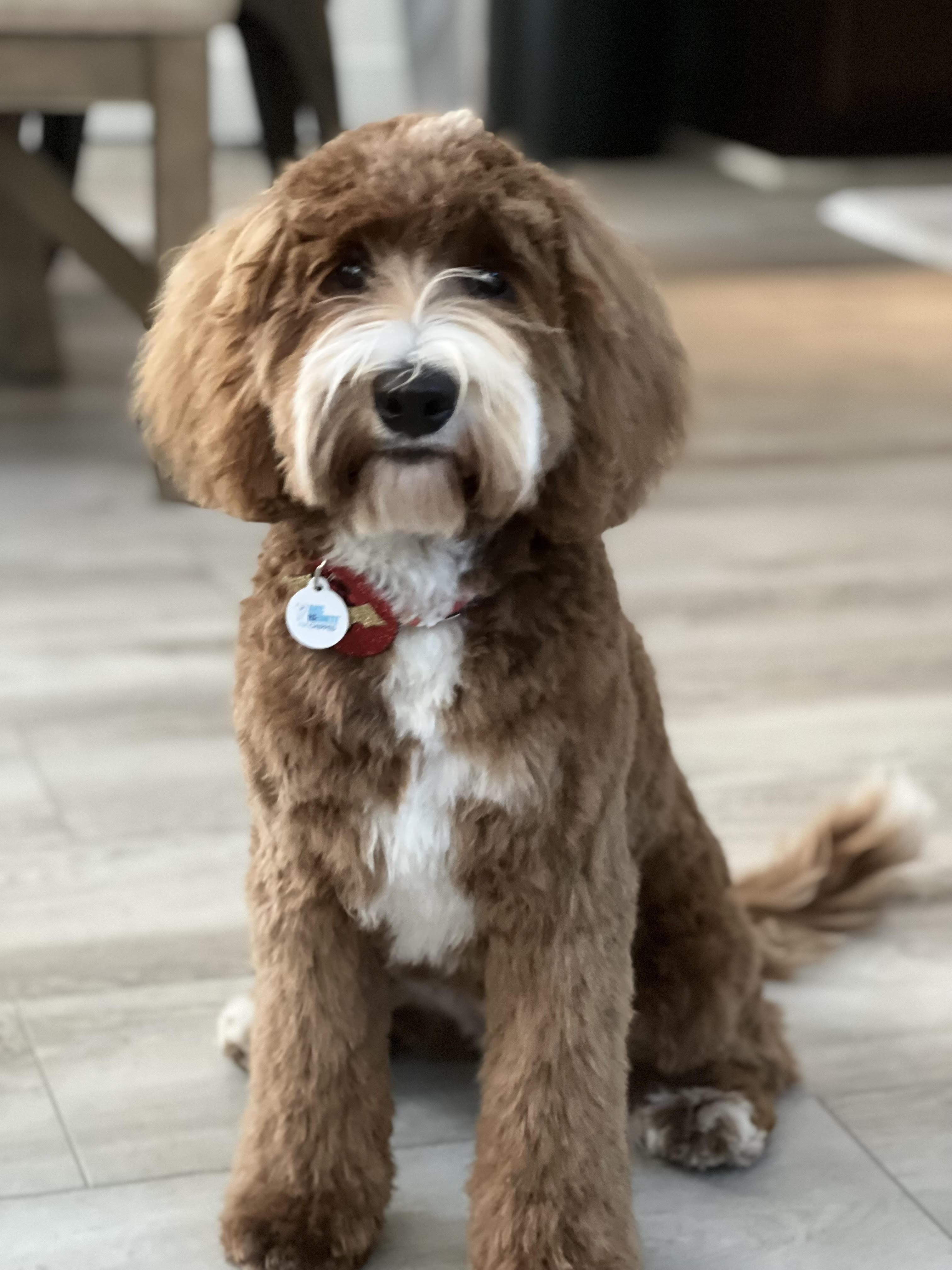 Bandits Chocolate Tri-Color Phantom Coat is not only beautiful to look at but is the softest coat we have ever felt! "He is the sweetest doodle, waking us with morning kisses daily. His playfulness keeps our home filled with laughter and joy. Loves long walks and his chew toys. He is a true blessing in our home." Katie Gonzales - Bandit's Momma