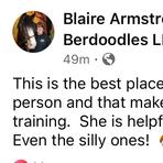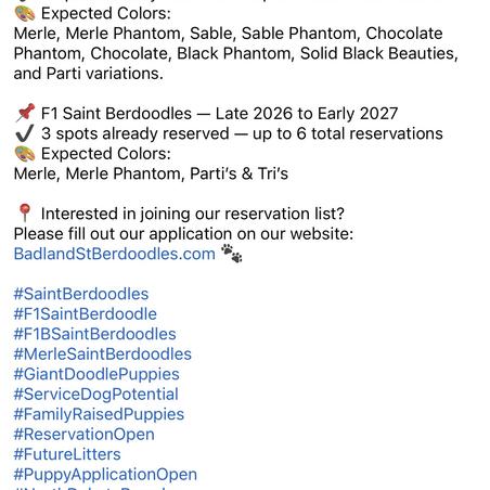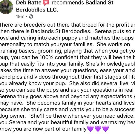 Serena is an exceptional breeder. You know from the beginning that her pups and parents health is top priority with her. She answers any questions you have regarding the process. She sends pictures and videos advising how your puppy is doing. They are happy and healthy pups. Laid back and true characters. Bundles of fun. Serena truly gives the personal touch. We recommend her highly! Badlands St. Berdoodles has beautiful pups! ❤️😊