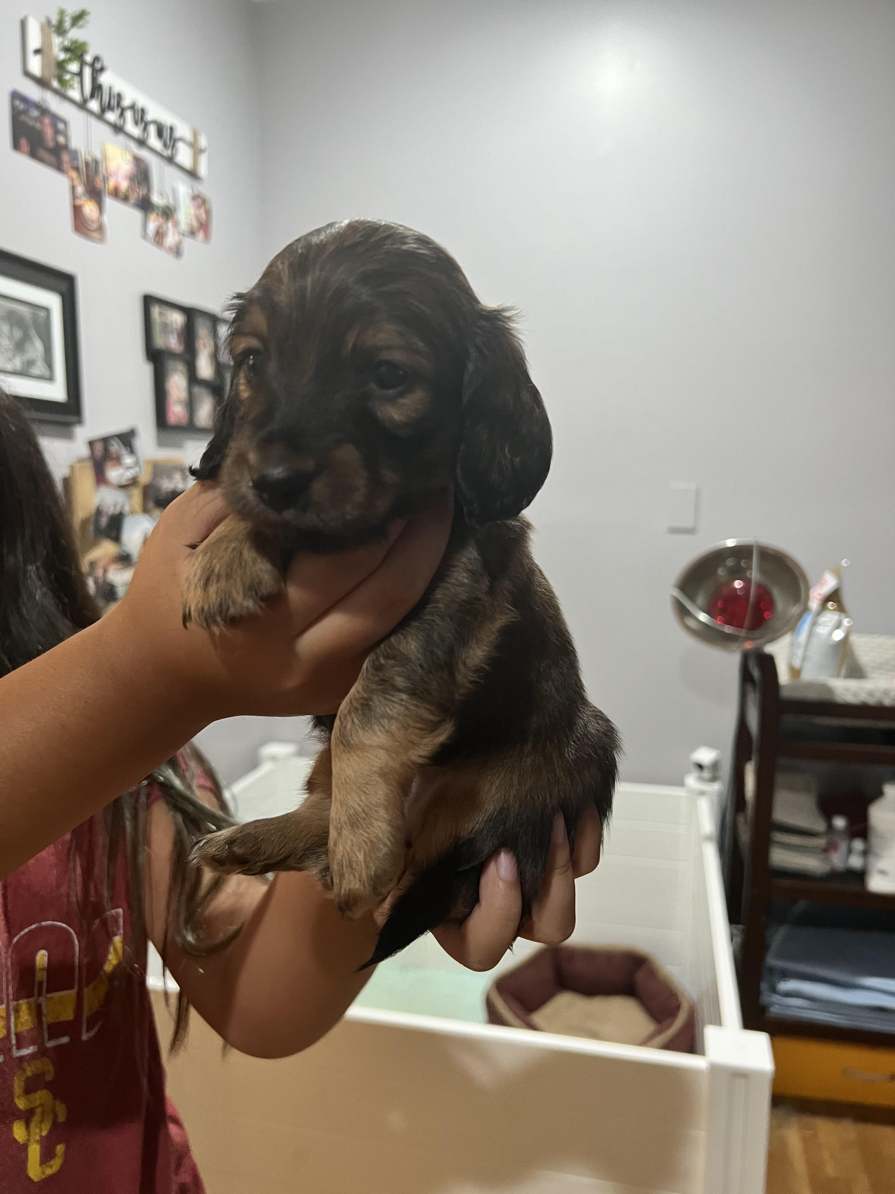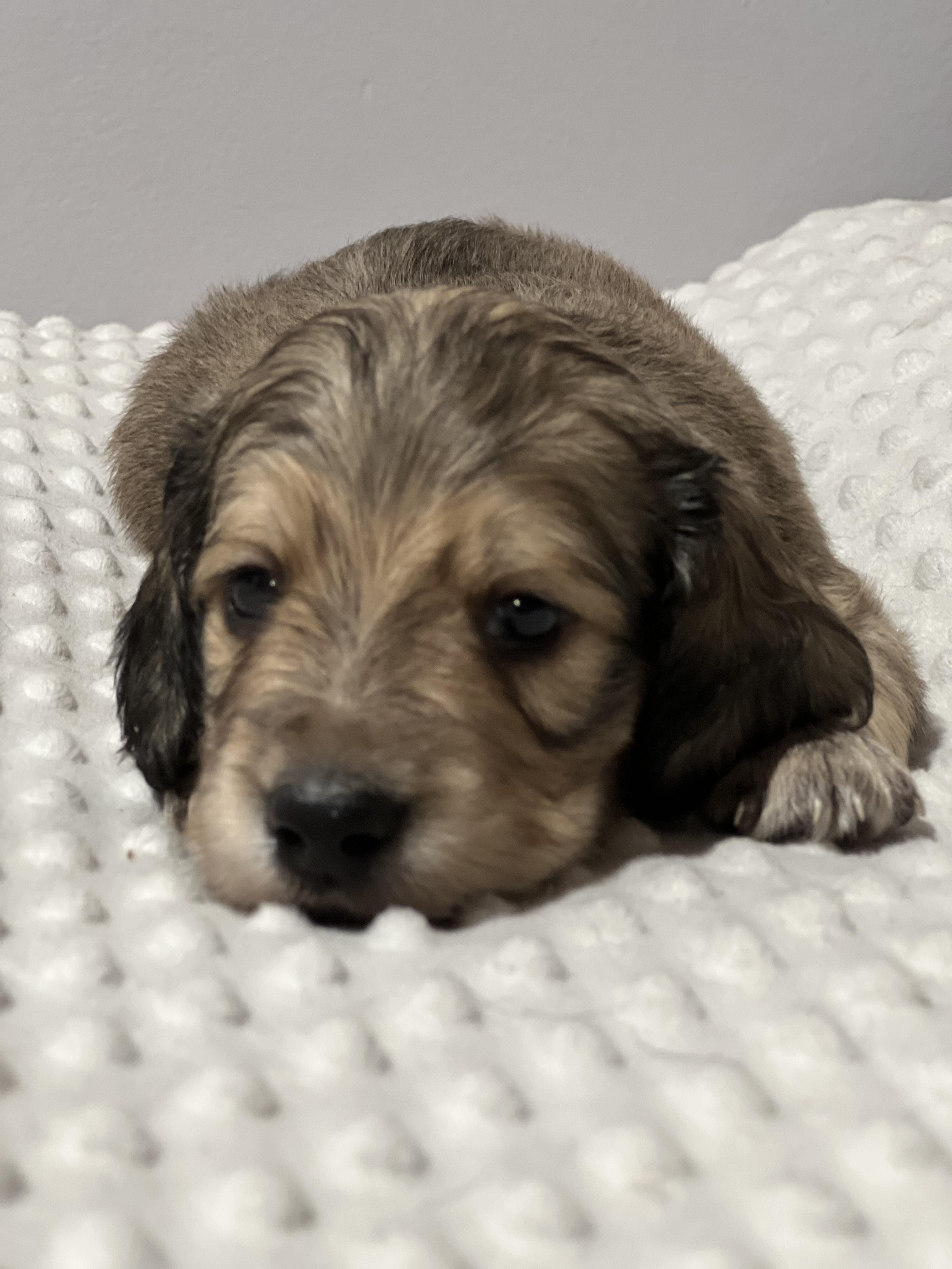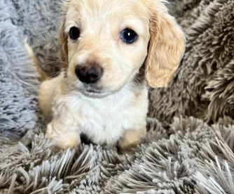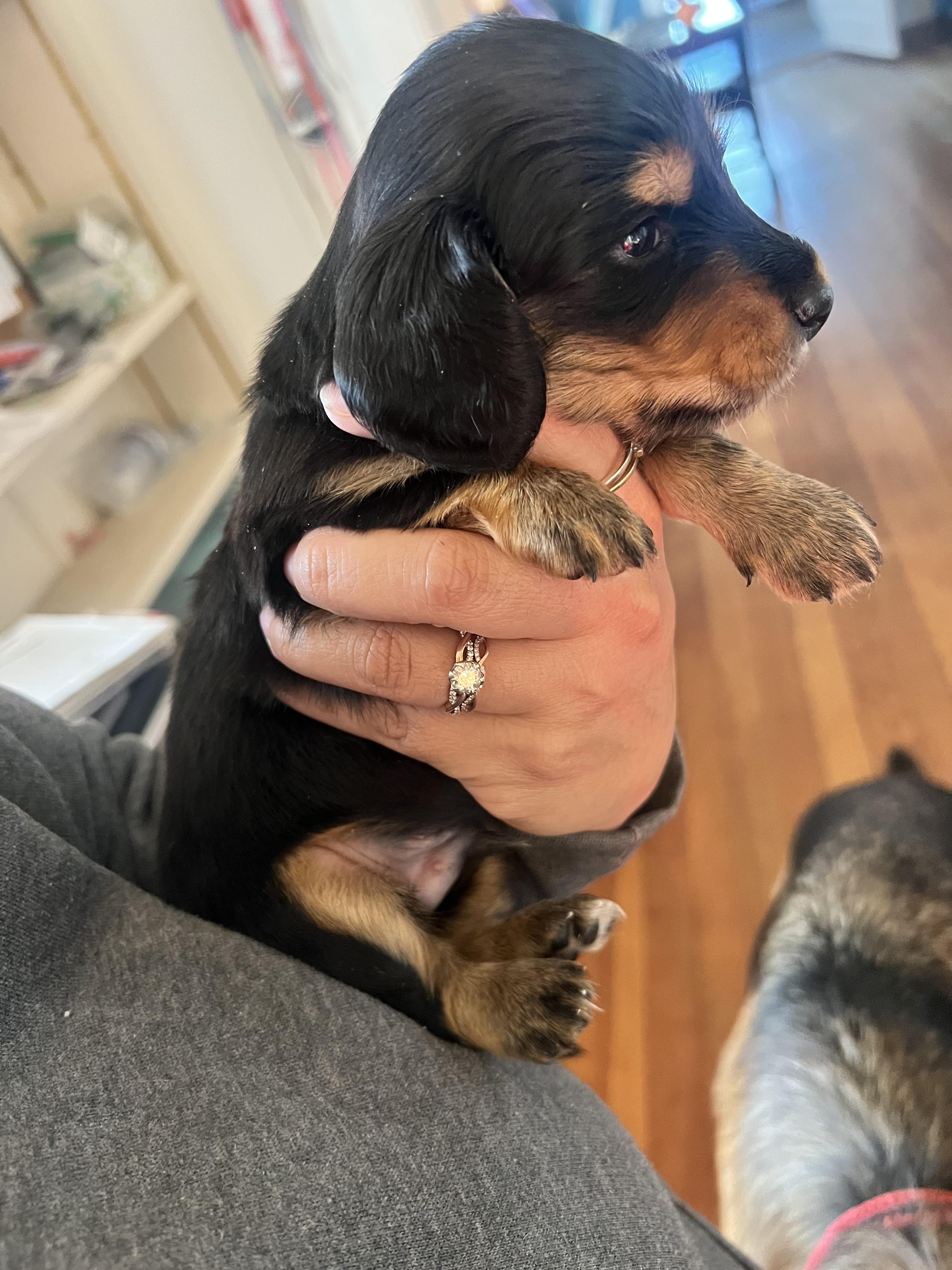 “We only have long haired miniature dachshunds. Parents are health tested and AKC registered. Puppies will come with Full AKC registration, age appropriate deworming and vaccines, vet cleared and microchipped and a contract that includes a 2 year health guarantee. Deposit ensures your puppy pick and counts toward final asking price of puppy.”