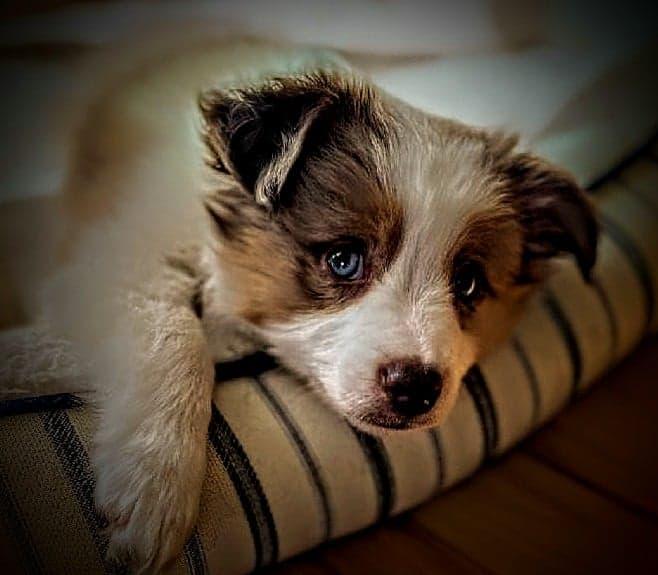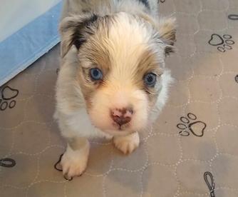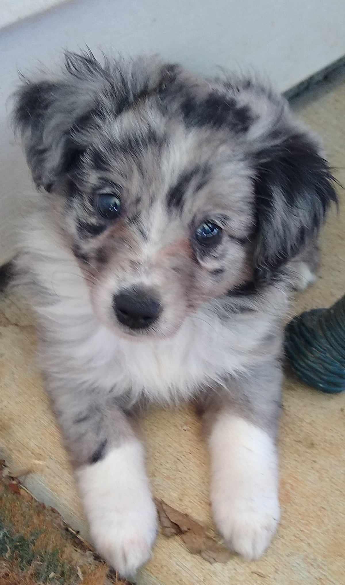 Blaze is a Toy Aussie he is on the larger scale of the toy breed. He is the offspring from Ella and Copper and was born and raised here on BaJa Farms. He is sweet, smart and very protective. He is a blue merle with blue eyes.