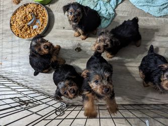 Our Cocker Spaniel puppies include brown white and tan, black and white, black white and tan, and black. Yorkshire Terrier puppies include black and gold and black and tan. Yorkipoo puppies include silver, black, and black and tan. Poodle puppies include apricot and black. Cockapoo puppies include black white and tan, black and white, and black and tan. Chihuahua puppies include black, chocolate, cream, fawn, fawn and white, black and white, black and tan, and blue merle. Colors will vary depending on the parent dogs.