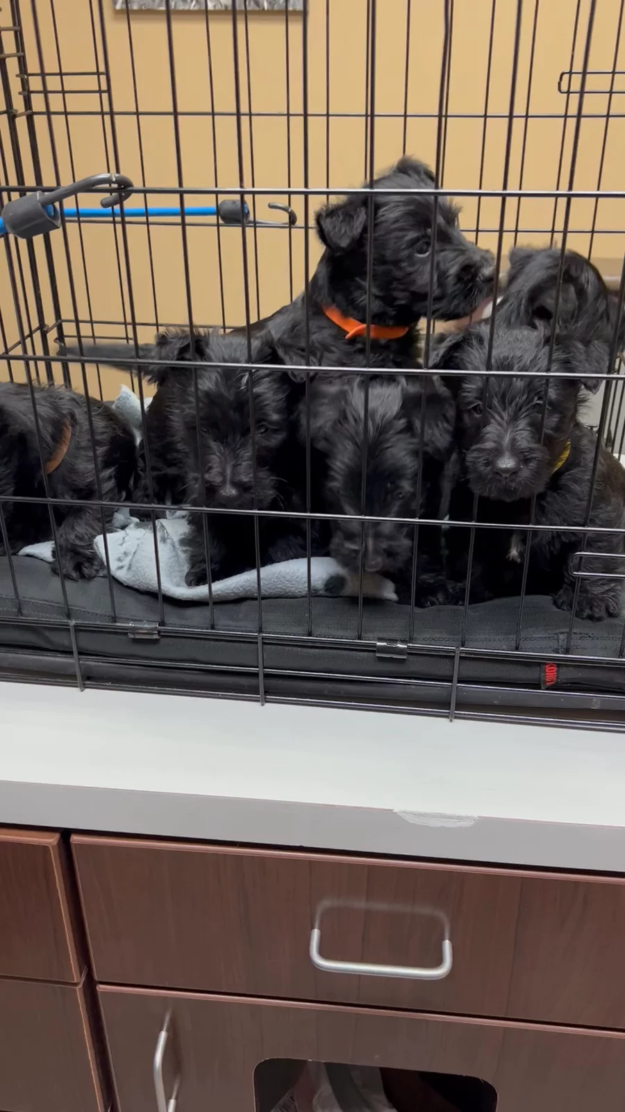 Their six week vet visit. We always add fun and chaos! Scotties, of course❤️