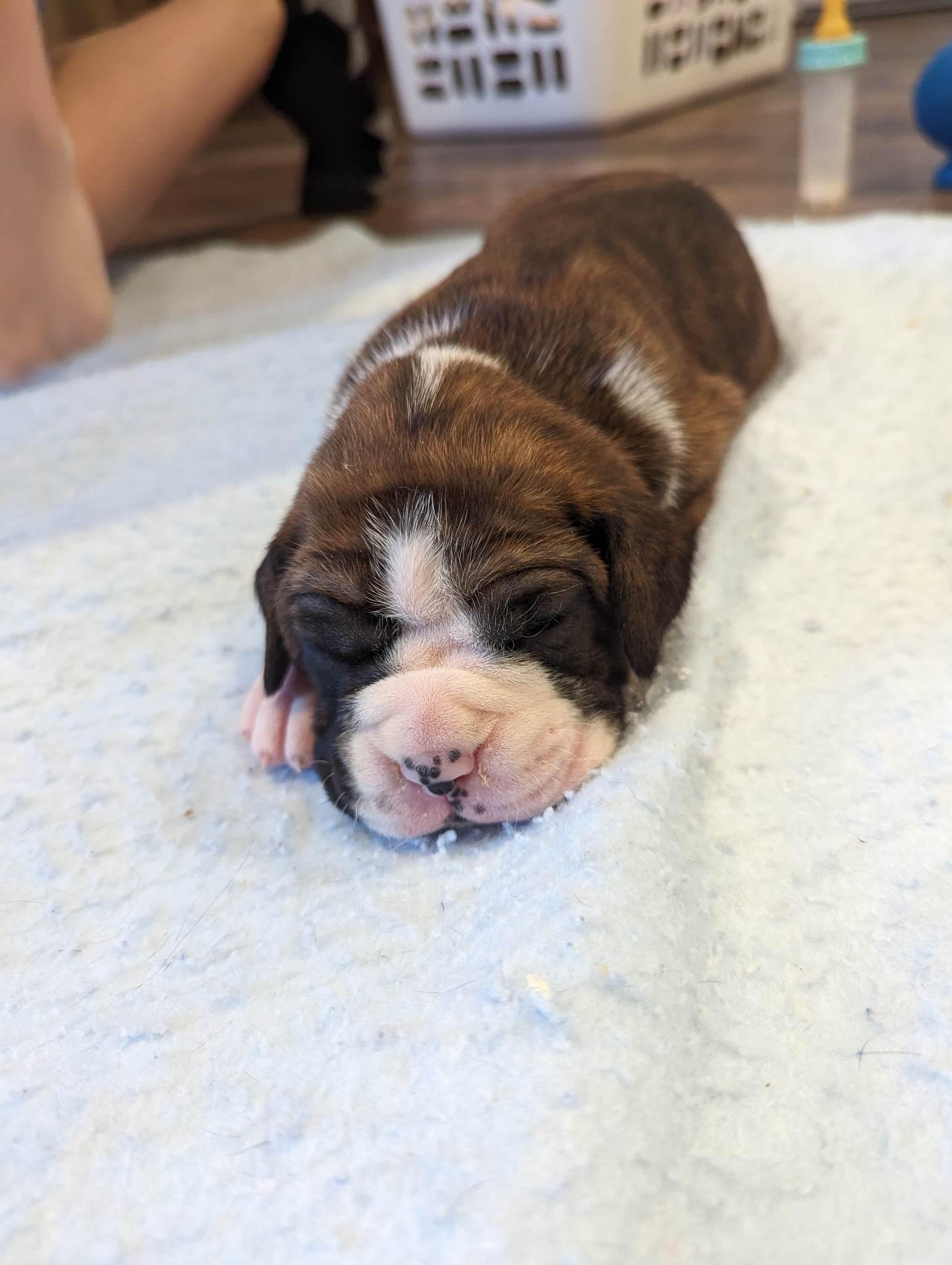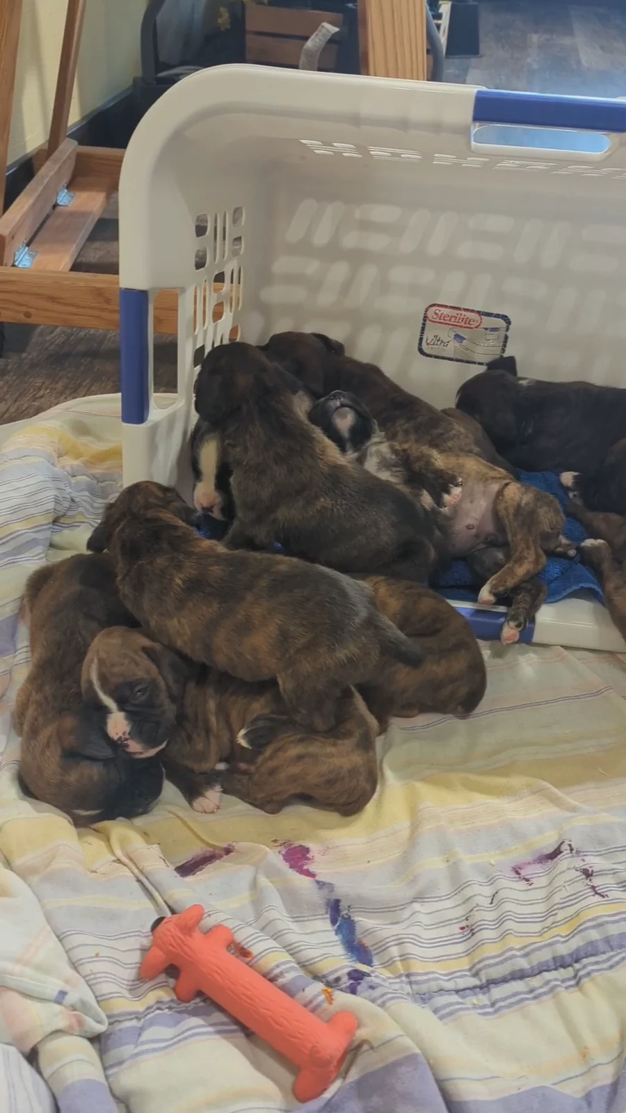 My story started out as a loss. Last November my family and my I lost our soul dog he was a boxer and his name was Ziggy we had him for 8 years. It was a sudden devastating loss most profound in my life and trust me I’m not stranger to loss. It didn’t take very long to realize that a home without a boxer just wasn’t a home I wanted. So I got online and started looking around it was winter time in my area so we were looking for litters due in the spring for easier travel. I must have messaged and talked to over 50 people with up coming litters. It was around Christmas time when I connected with Jenna, and I’m pretty sure I knew from the first time chatting with her she would be where my next puppy would come from. She had a litter due around February I think and it just wasn’t the right time for us yet but at the last minute she had one puppy left from that litter we tried to get but the same day he was scooped right up. I talked to Jenna more often from this point on right up till pick up every week or so. She talked to me about why she got into breeding and how it’s not a job or form of making money just about bringing new love from a boxer to families that need it. That her dogs and puppies are family from the very start and always . That was very clear and easy to see from the start. Not to say ill things about others but do research and more research when looking for a new addition to your home there were a-lot of people and things that didn’t sit right with me. My dogs are my family they are not just a thing for me to profit from and that was true for Jenna too. Jenna kept us updated from the hooking up stage to ultrasounds and birth and everything in between and after. Answered any questions and give any advice I asked. Myself and my husband and our family looked over the litter born in April and we had first pick since we were in line before these puppies were even puppies yet. We instantly liked a few others from the litter in fact “Ted” Koda wasn’t even in question on that list at first But as they grew and she sent group photos and videos “Ted” Koda was so different form the rest I just knew he was ment for our family. Jenna sent weekly photos up till pick up and even additional ones and when I asked her to. She sent videos of all his progress and growth and it never felt like we were 7 yes 7 states away. My husband and I planned this trip out to Iowa by car mind you and made the over 2000 mile drive to meet Jenna and pick up Koda. Jenna was amazing and become family to me she is a huge part of my healing journey now. I will understand dogs don’t live forever and the pain from losing Ziggy will always be part of my story now but Koda and Jenna healed me in ways they will never know. Jenna will always be a small but big piece of my story going forward. If you want a new puppy Jenna and her family are over the top the best greatest choice!!! They did an amazing job socializing, potty training and implementing commands plus creat training. Koda sits already and is making great progress on his leash after 12 hours of using one.