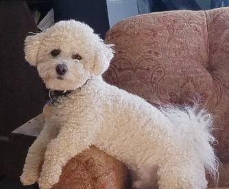 Penny is a tiny Bichon Frise but she has a big personality! She loves to wear tee shirts and to go for car rides. She is a wonderful mother!