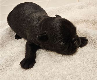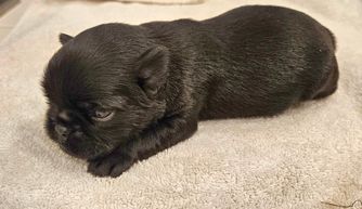 Sal is a beautiful black Brussels Griffon female with a fun, affectionate personality. She’s out of Angelorum Ultra Chic and sired by Tseden Oliff Iz Ataki Griffonov, combining two well-known European lines that are loved not just for their looks, but for their charming and people-oriented nature. Sal is smart, expressive, and full of character — the kind of dog who loves being in your lap as much as she loves exploring the world around her.