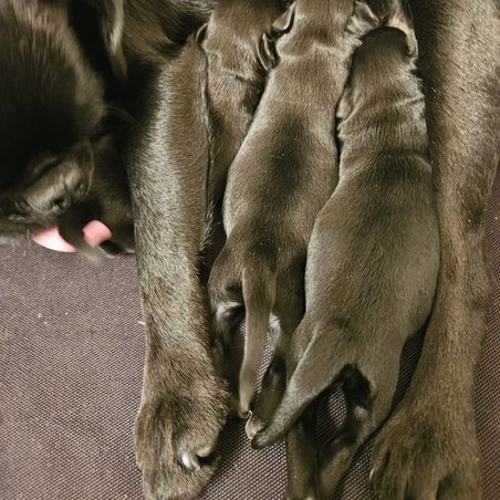 Black pups. 1 boy , 1 girl left . Possibly rough or smooth coat
