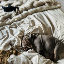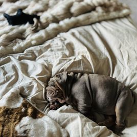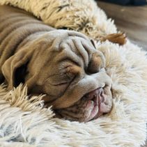Lagertha (aka Carol) is one of the prettiest bulldogs you will ever see and her personality is every bit as beautiful as her coat! She's extremely loving and affectionate, she loves to snuggle and is great with kids. When she's not cuddling with us on the couch she can be found passed out face first in her feeding dish or snoring in her bed, dreaming of her next meal. She's a great mother and has been very gentle with her pups.