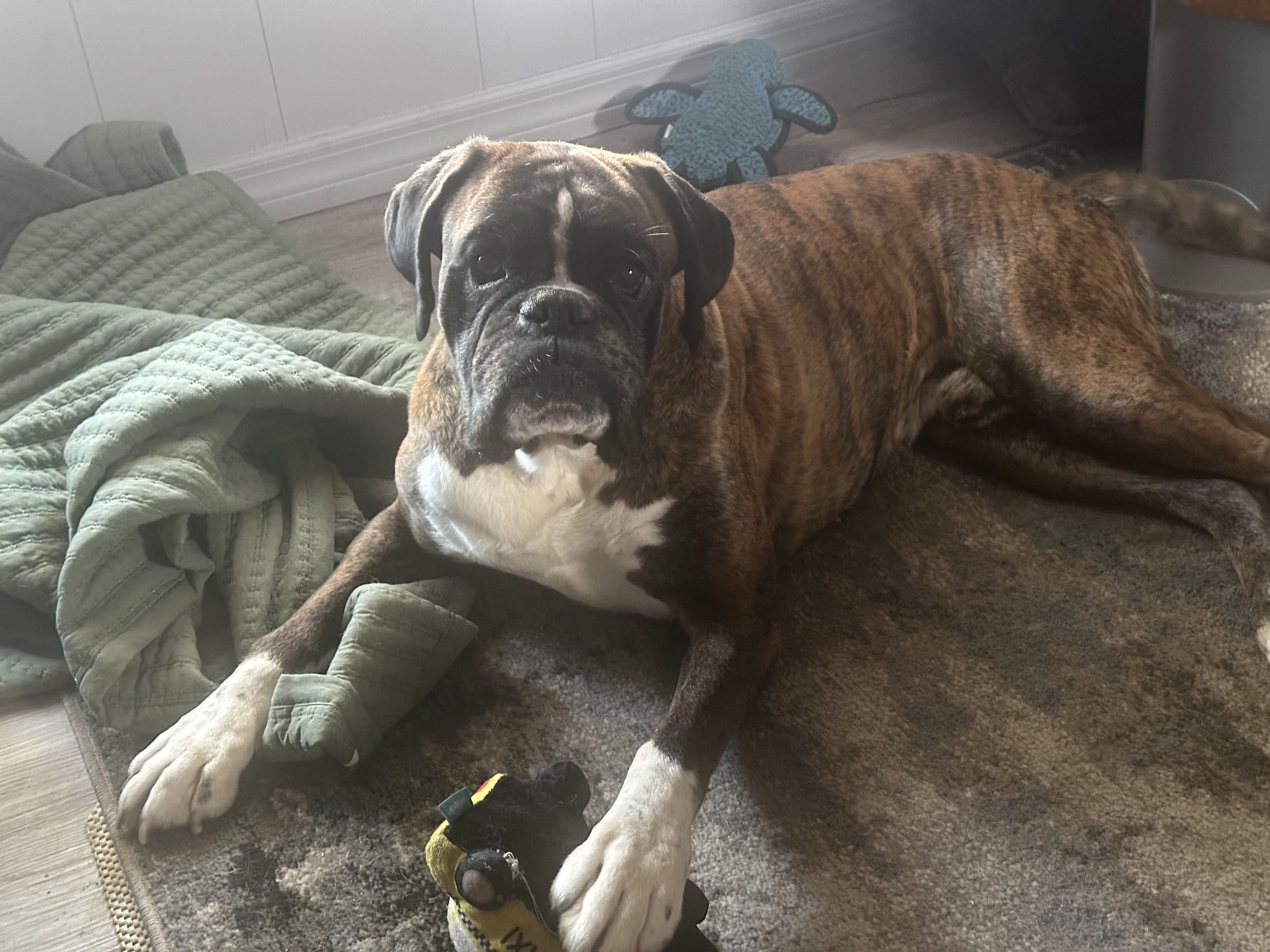Dezi, our beautiful AKC-registered European Boxer girl with a heart full of love and a gentle soul. Dezi is not only stunning in appearance but also comes from health-tested lines, ensuring strength and well-being in every way. She’s a devoted and nurturing mom, known for her sweet temperament, playful energy, and deep bond with her pups. Whether she’s snuggling on the couch or keeping a watchful eye over her little ones, Dezi truly embodies the loyal and loving spirit of the Boxer breed.