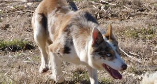 A black and white female, genetically health tested clear, Carries dilute, she is linebred JJ and he main job is working stock. She also participates in Bikjoiring.
