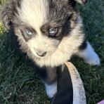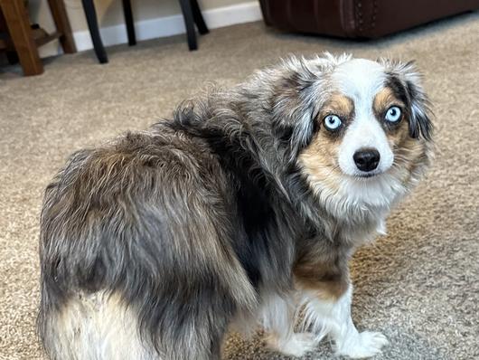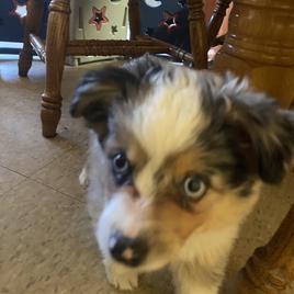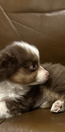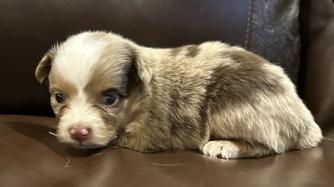 Harlee is a gorgeous blue female that is 13 inches tall with one blue eye. She is extremely loyal, mild mannered, easy going and very intelligent, she has stunning copper and Merle markings and throws that in her pups!