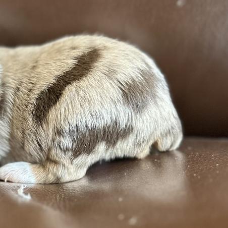 Gypsy is a double blue eyed Merle that has a very beautiful striking Merle pattern. She is heavy built is 13 inches tall. Gypsy has never met a stranger she’s happy, loving, adventurous, and silly! Her pups carry her personality! She is third generation Bar M breeding program.