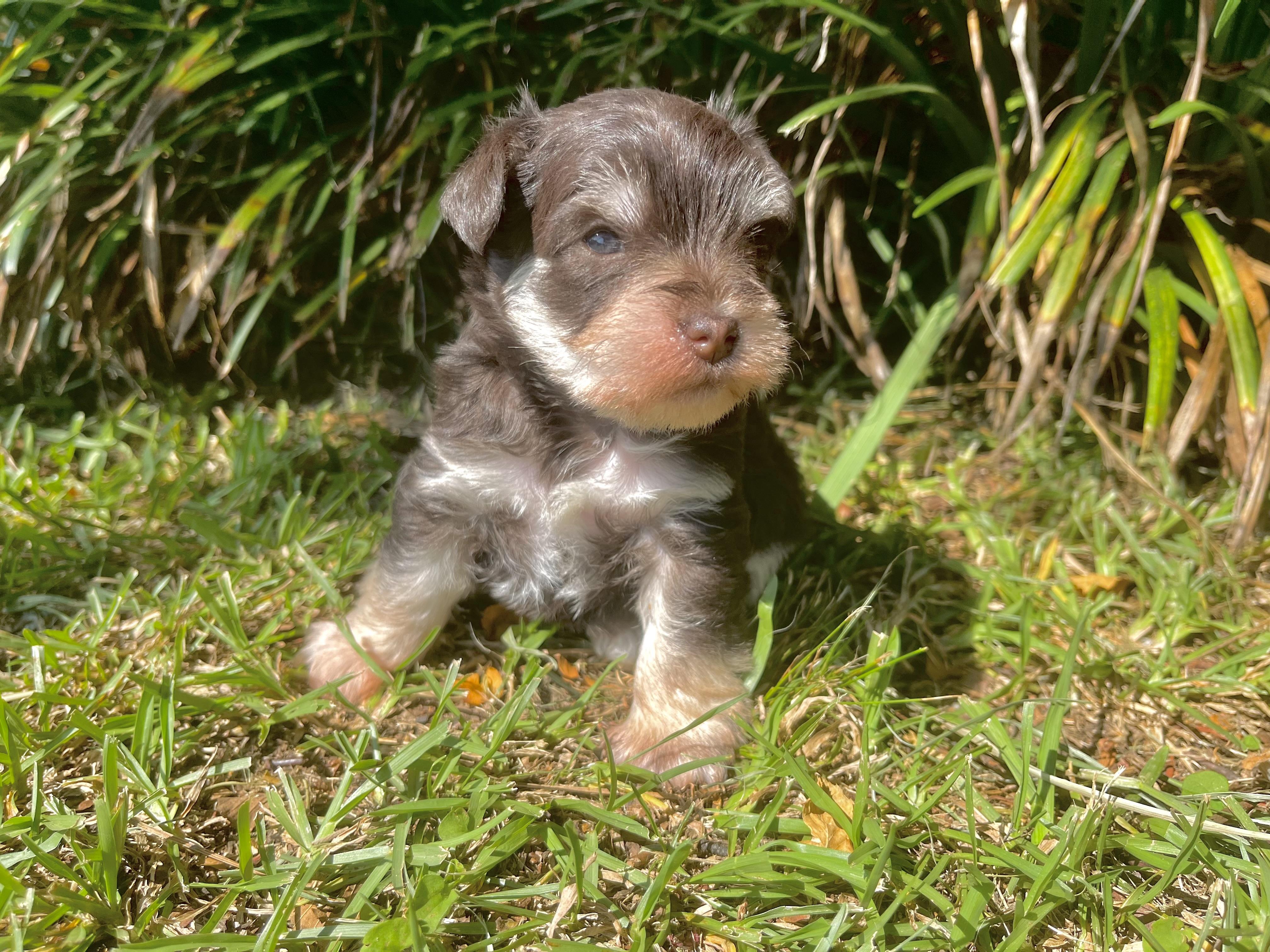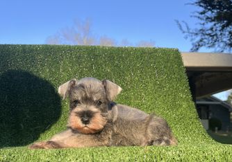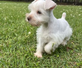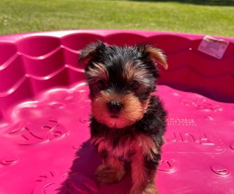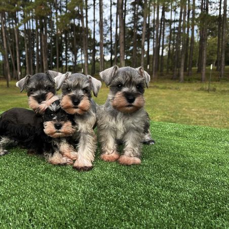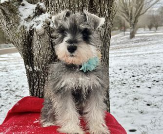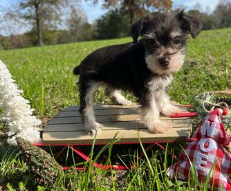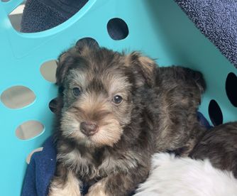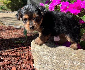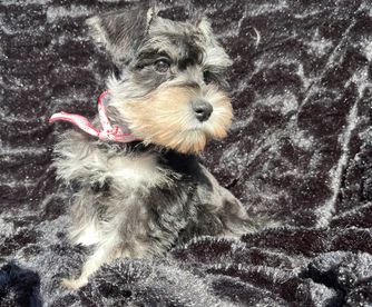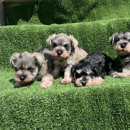 Our Yorkshire Terrier puppies include tan, blue and gold, and black and gold. Miniature Schnauzer puppies include white, parti, liver, salt and pepper, black and silver, and black. Colors will vary depending on the parent dogs.
