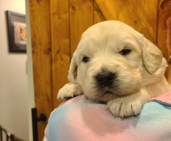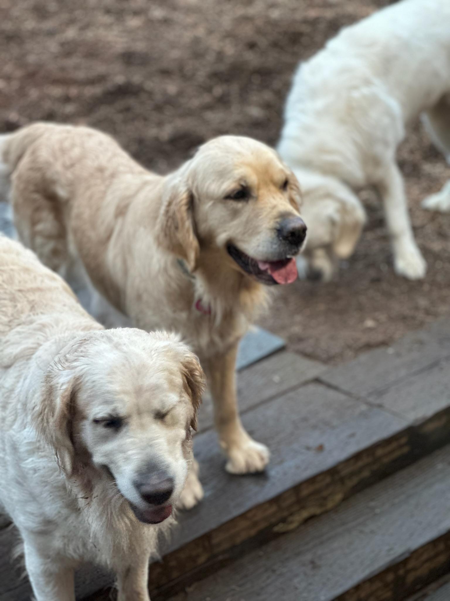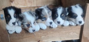 Our Australian Shepherd puppies include blue merle and black tri-color. Golden Retriever puppies are light golden. Colors will vary depending on the parent dogs.