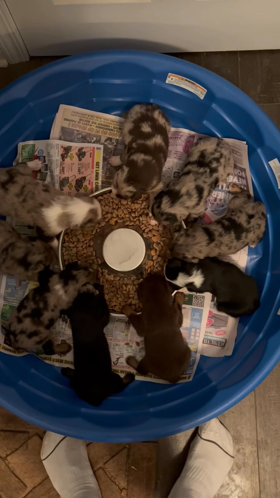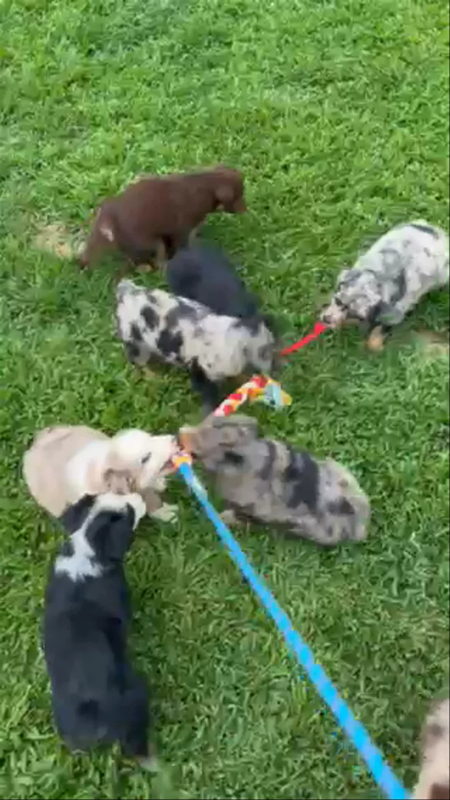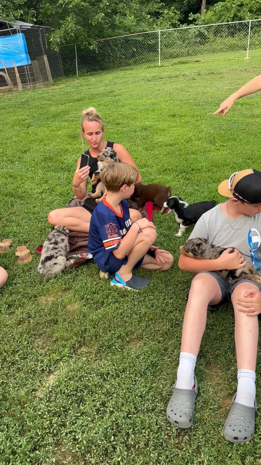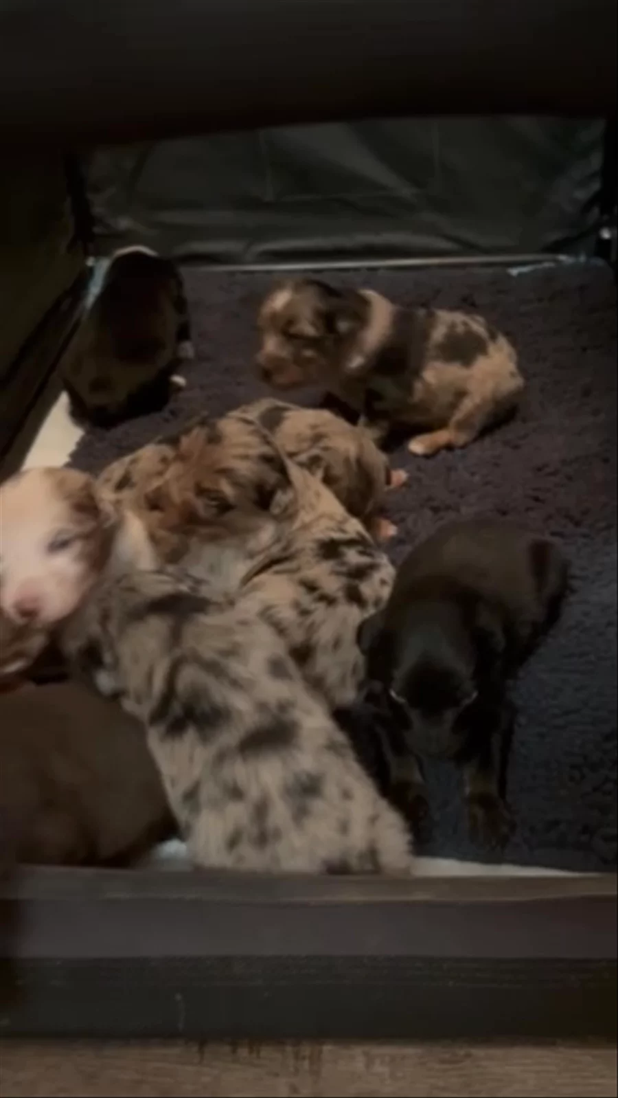 Our puppies include red merle, blue merle, red, and black tri-color. Colors will vary depending on the parent dogs.