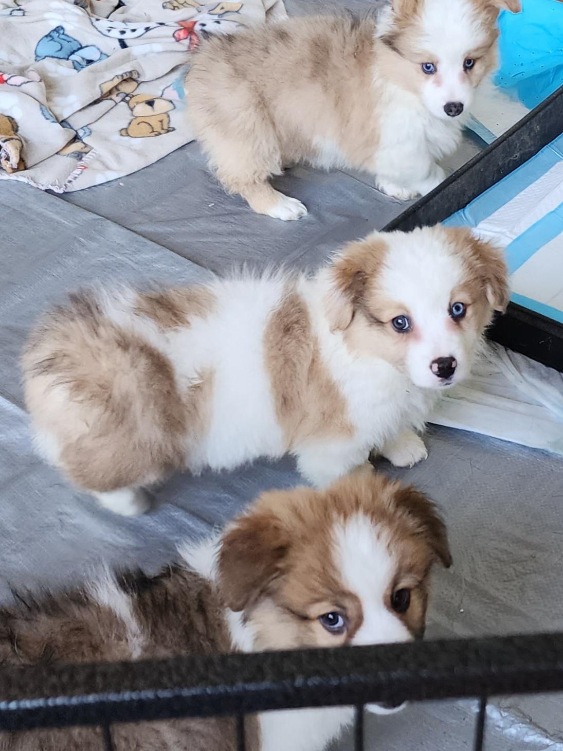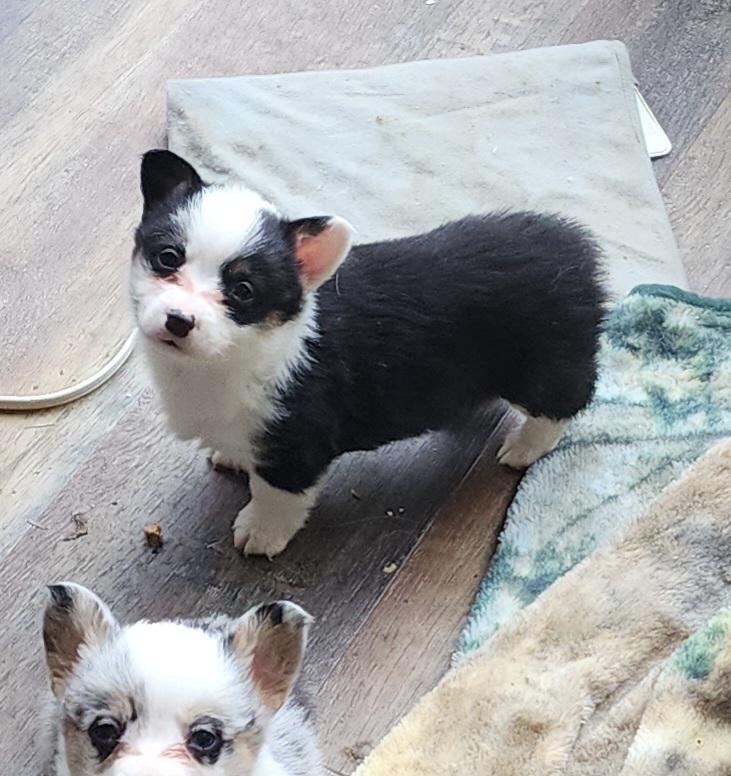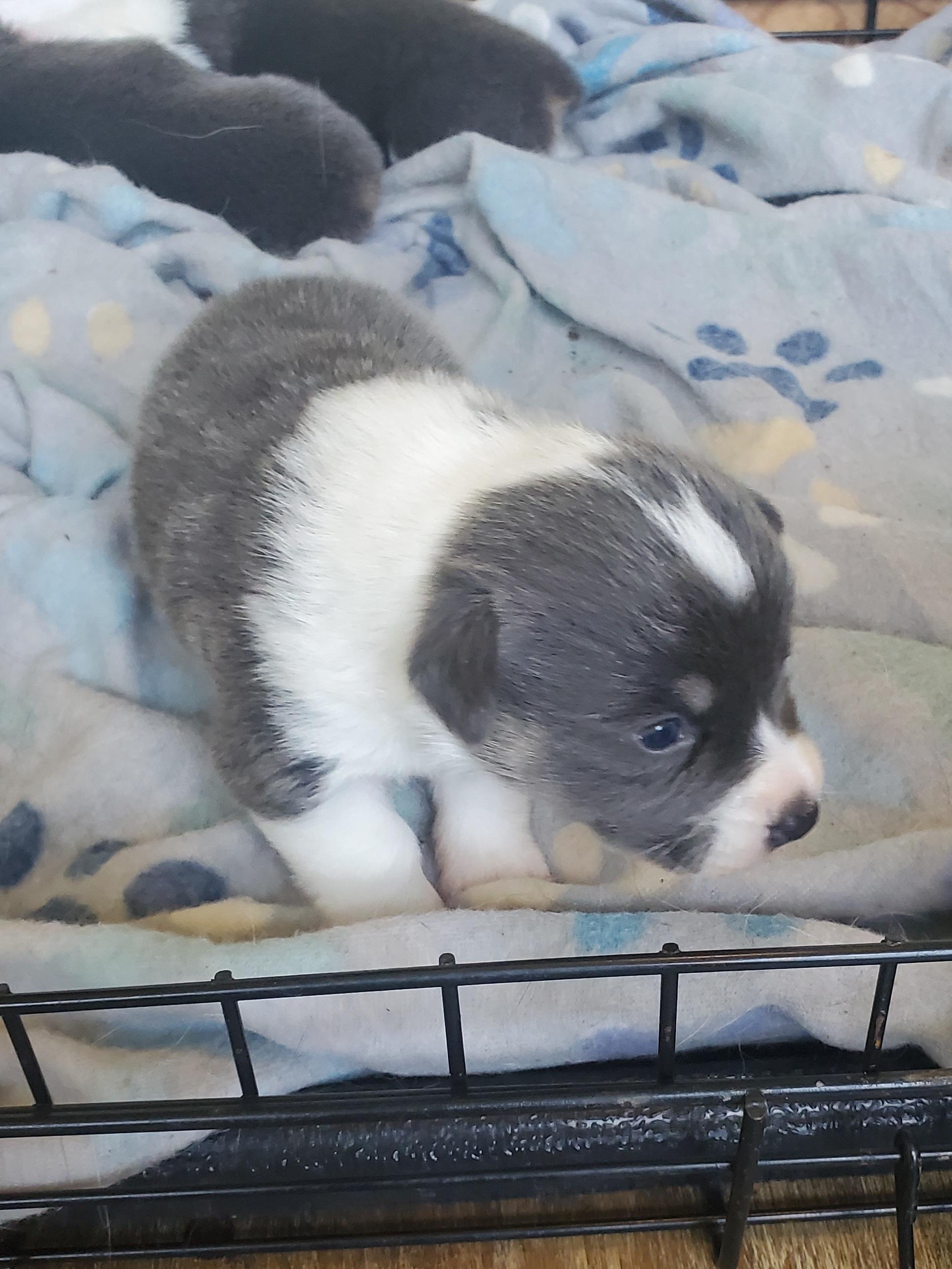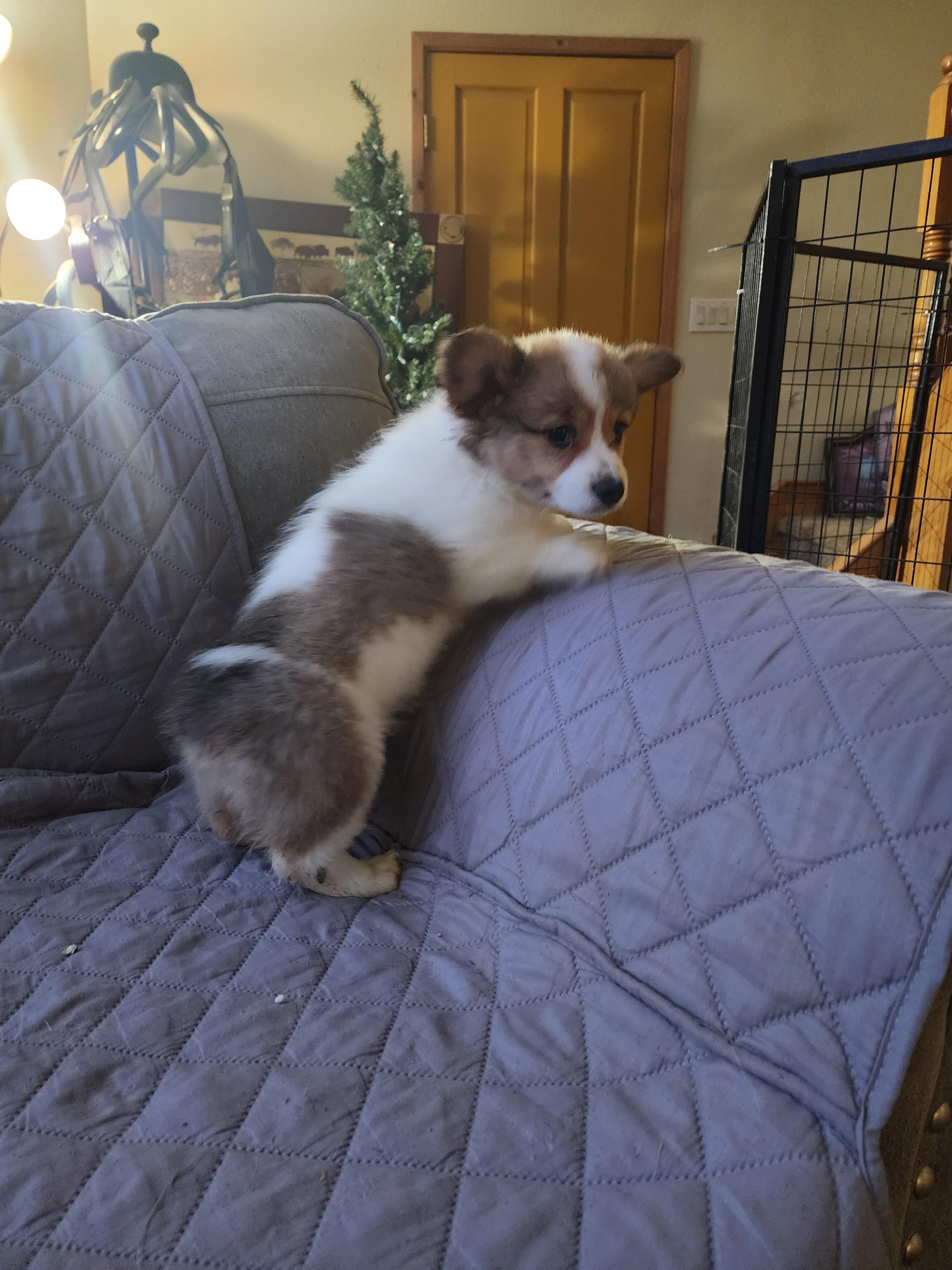 American Corgi puppies are red merle and white. Colors will vary depending on the parent dogs.