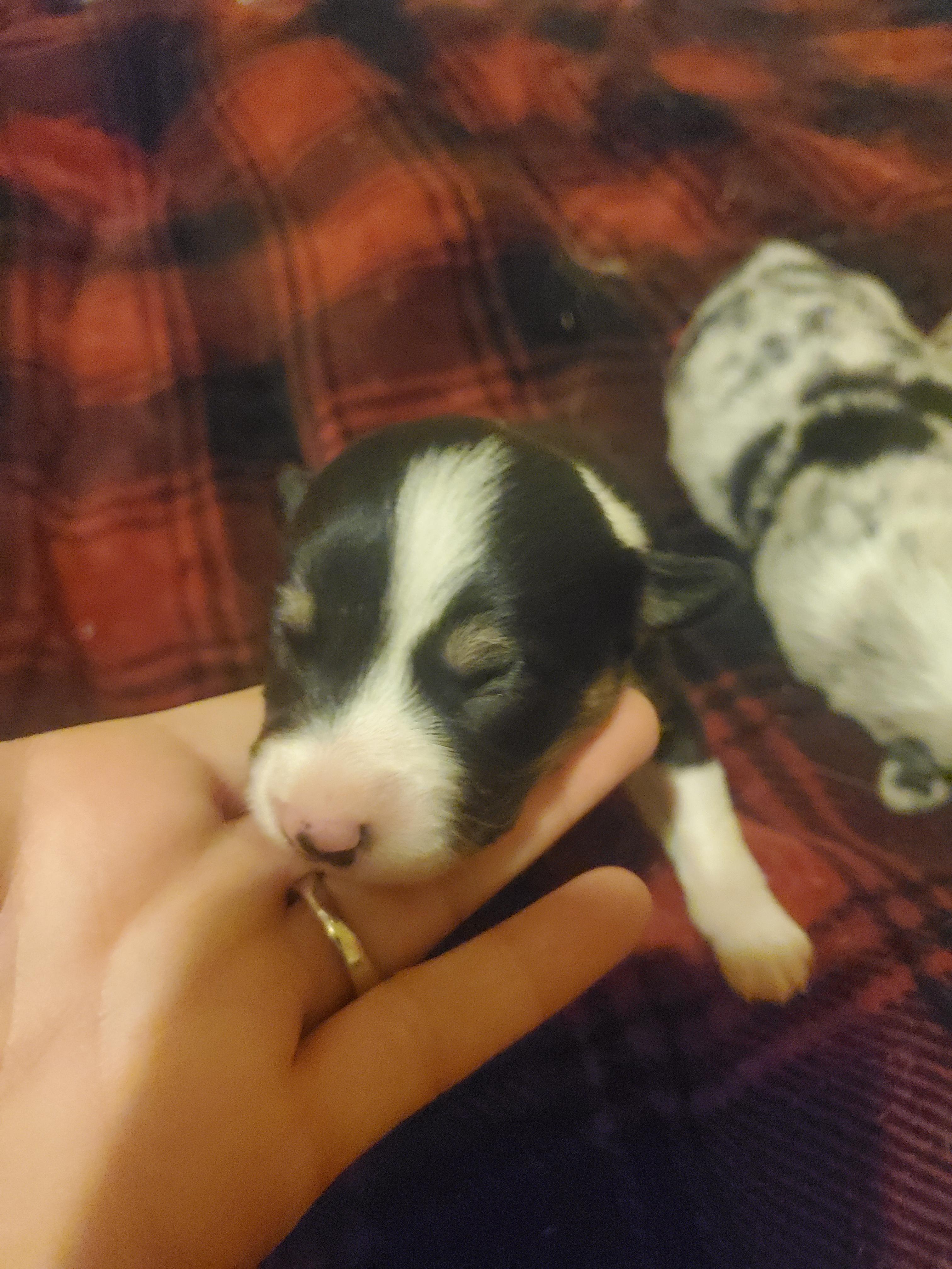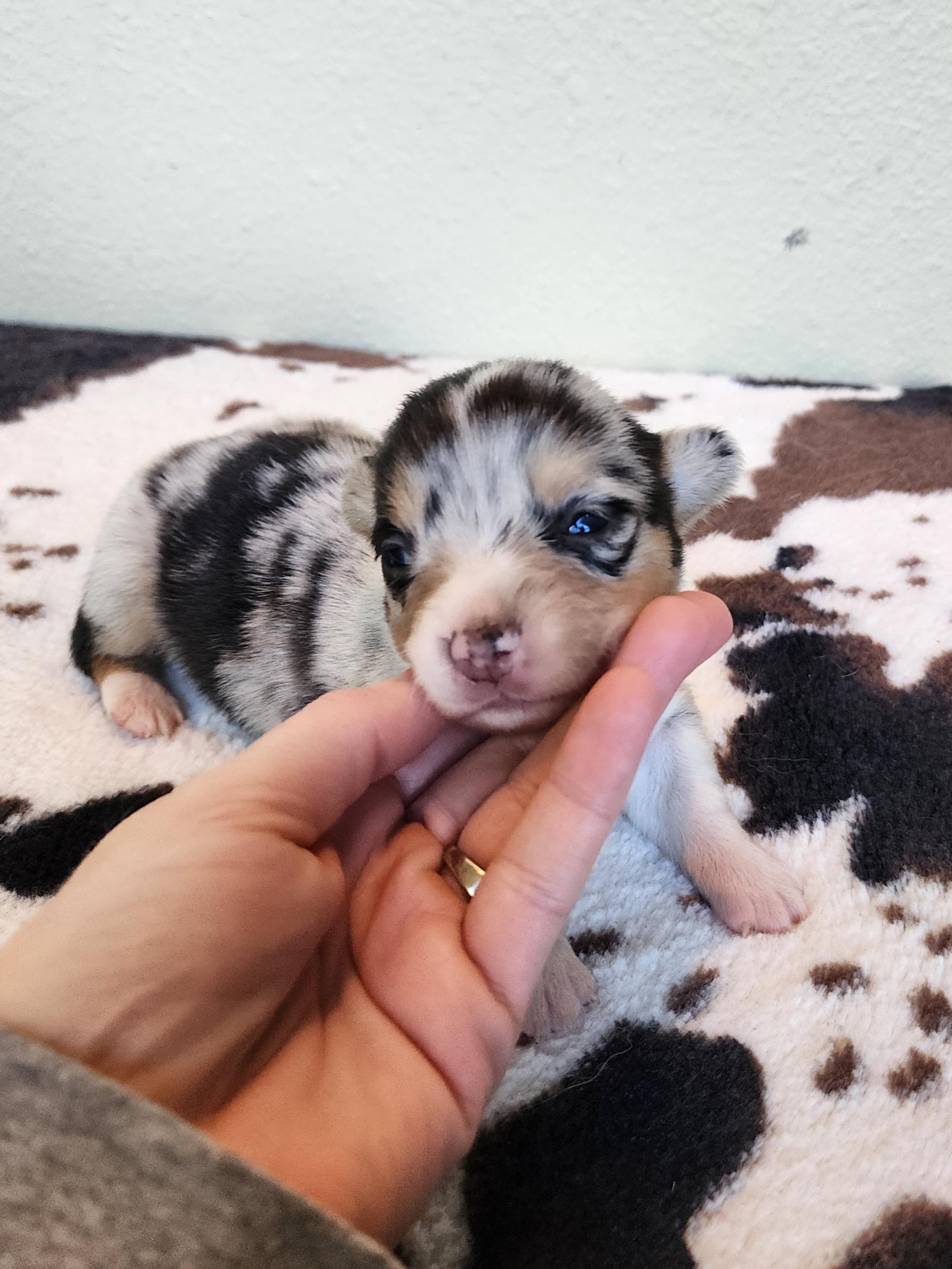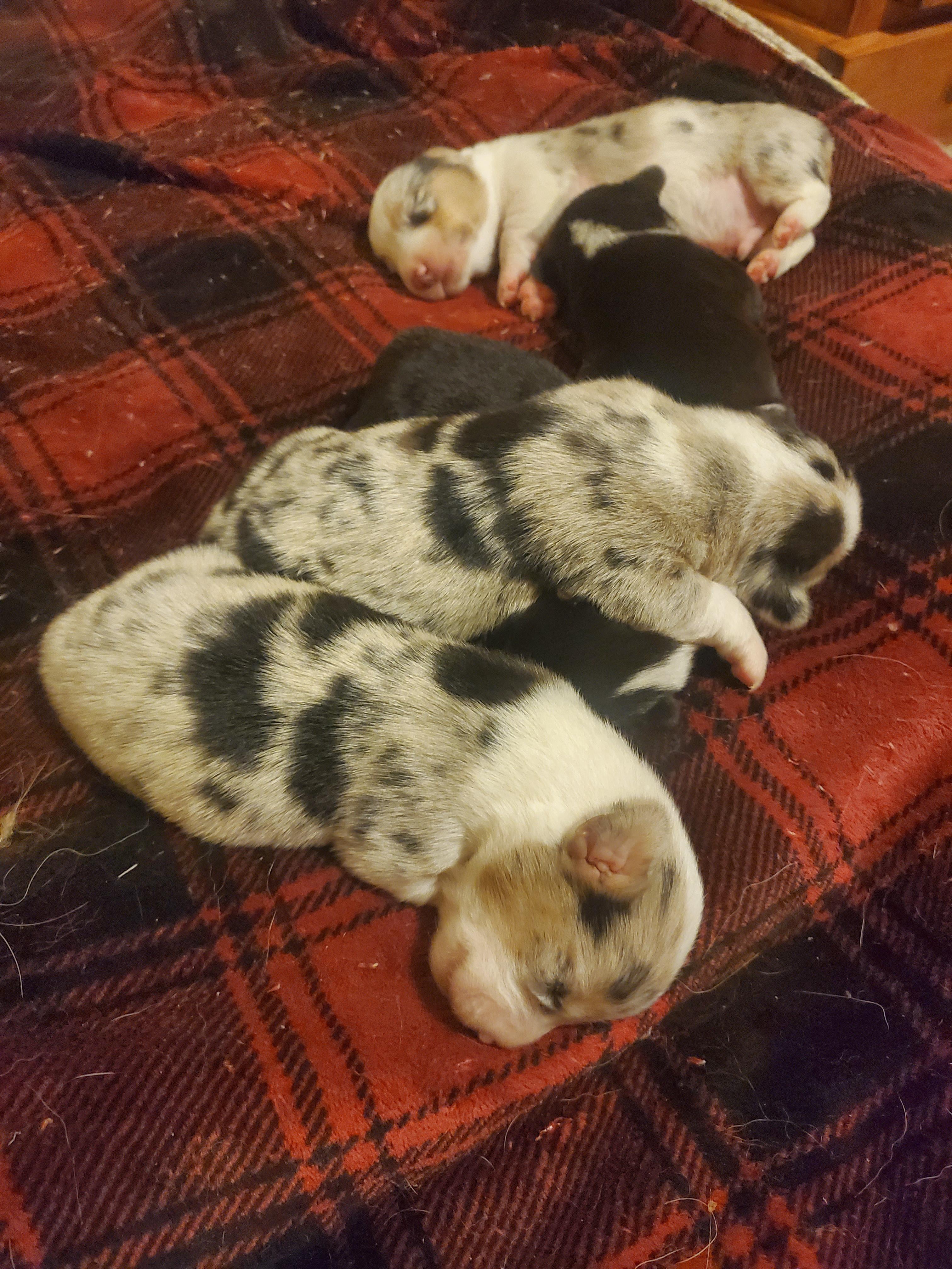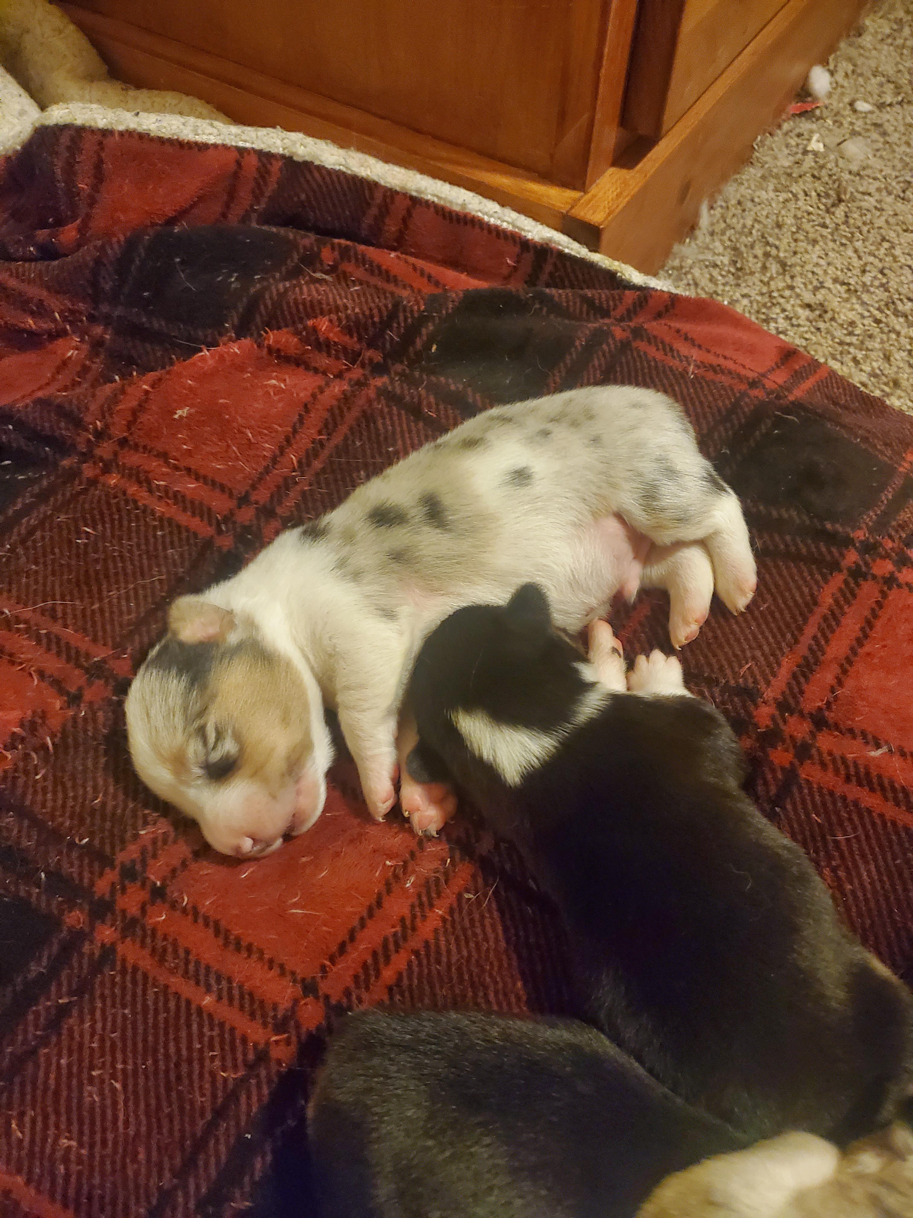 American Corgi puppies are red merle and white. Colors will vary depending on the parent dogs.