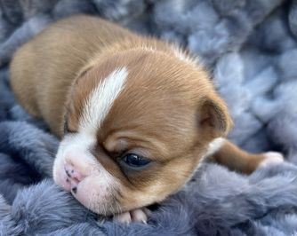 Maggie is small at 14lbs (she’s the smallest I have). She’s a large loving package for that size. She gives kisses and is gentle natured. She’s just a sweetheart. She is a Brindle who carries splash and tri. She also comes from imported lines.