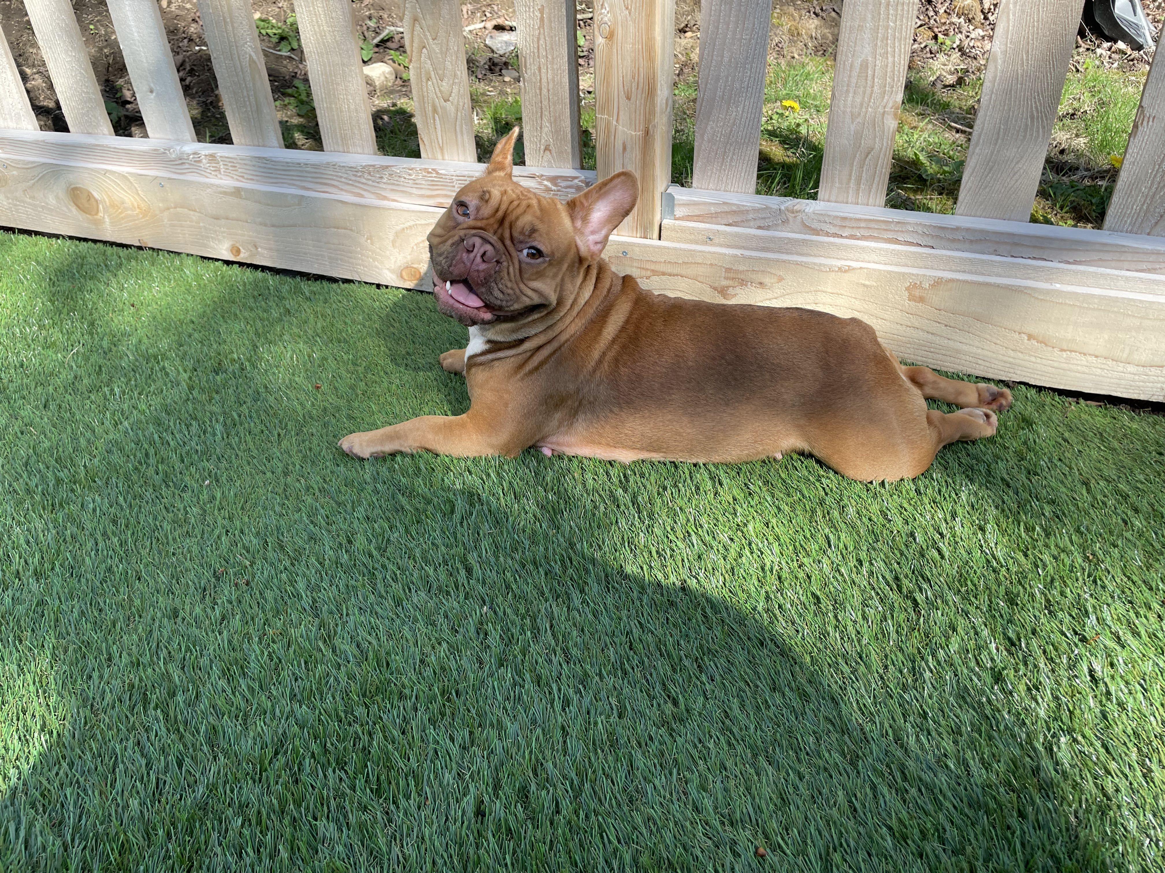 Baron is a very athletic frenchie and runs circles around all the others. He is also a very calm dog personality wise and switches easily to playfulness among the other dogs with zero bad behaviors. Puppies of baron are going to be amazing and I couldn’t pick a better dog to have.