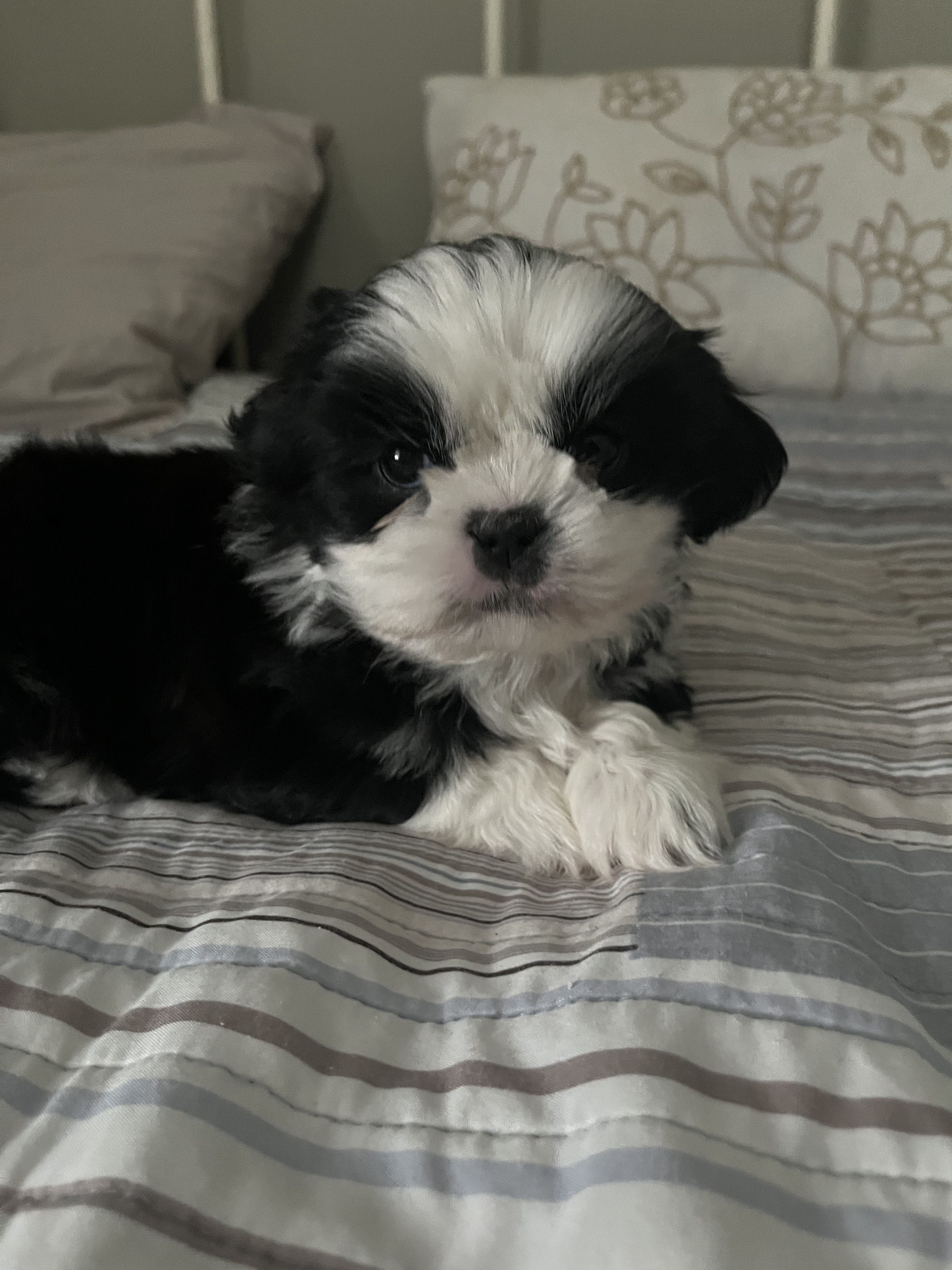 Our Golden Retriever puppies are golden. Shih Tzu puppies are black and white. Colors will vary depending on the parent dogs.