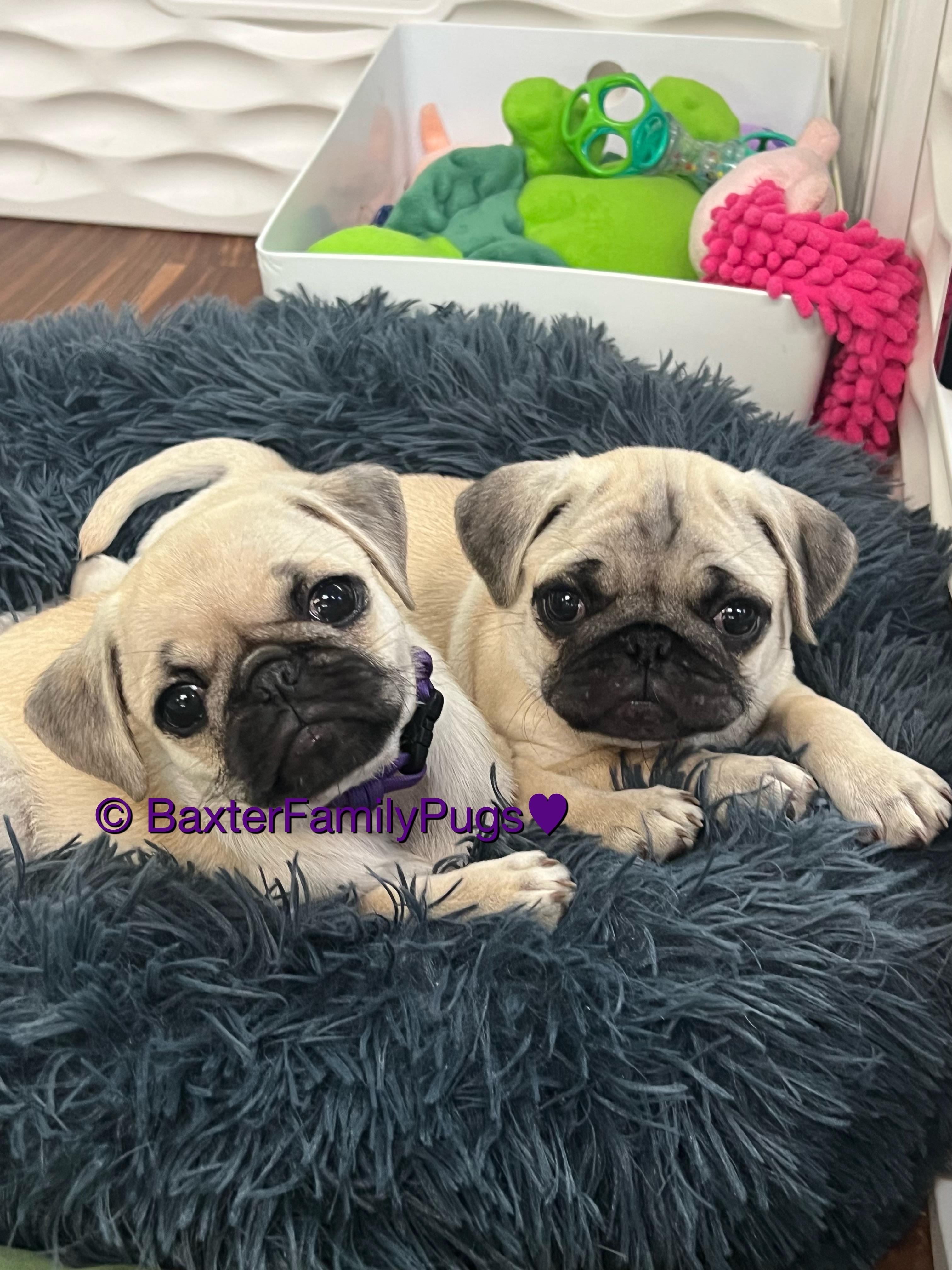 Vickie helped me and my sister surprise our mom with her pug baby boy on her birthday. She’s very responsive and kept us updated with texts, videos, and pictures until it was time to take him home! Not even 6 months later my parents contacted her to surprise me and my sister with our own pug babies! She’s professional, honest, and loves and cares for each baby in every litter. She has a good heart and I’m so glad that I found her and took a chance. We have 3 pugs from Baxter Family Pugs and hoping to get a 4th very soon!