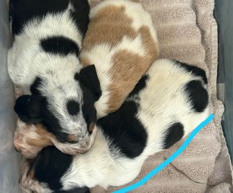 Our puppies include red and white, mahogany and white, and black tan and white. Colors will vary depending on the parent dogs.