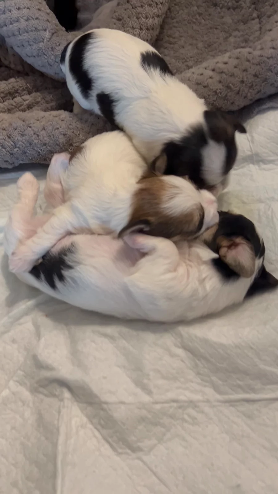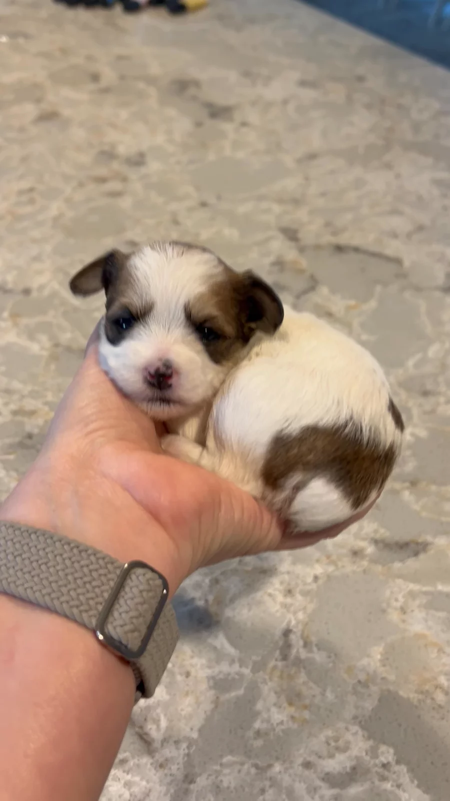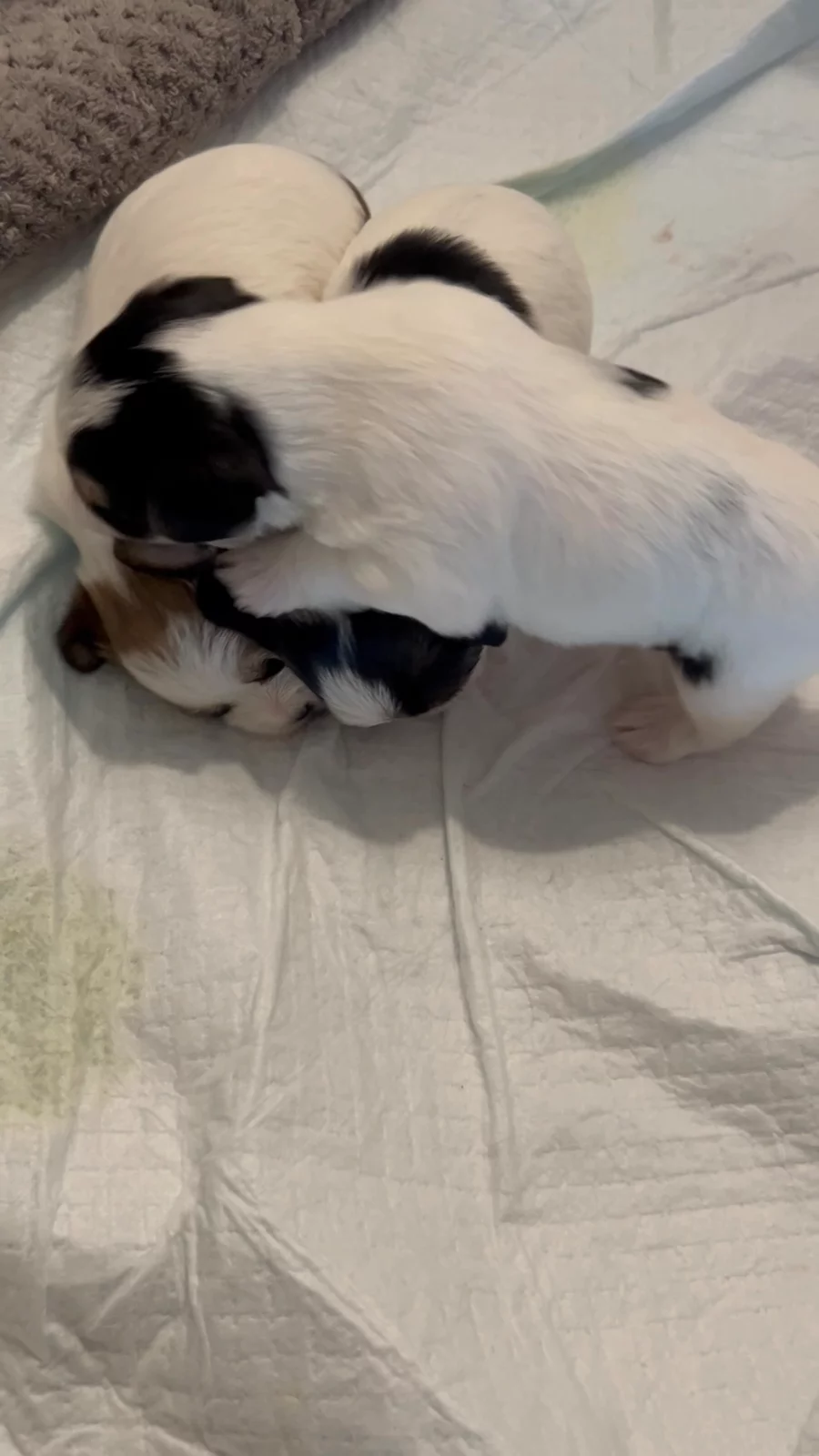 3 weeks old! Wobble-walking, barking, playing. Officially moved to the play pen for more space and practice with the potty pad 🩵 Weights range from 15 oz-1.3 lbs.