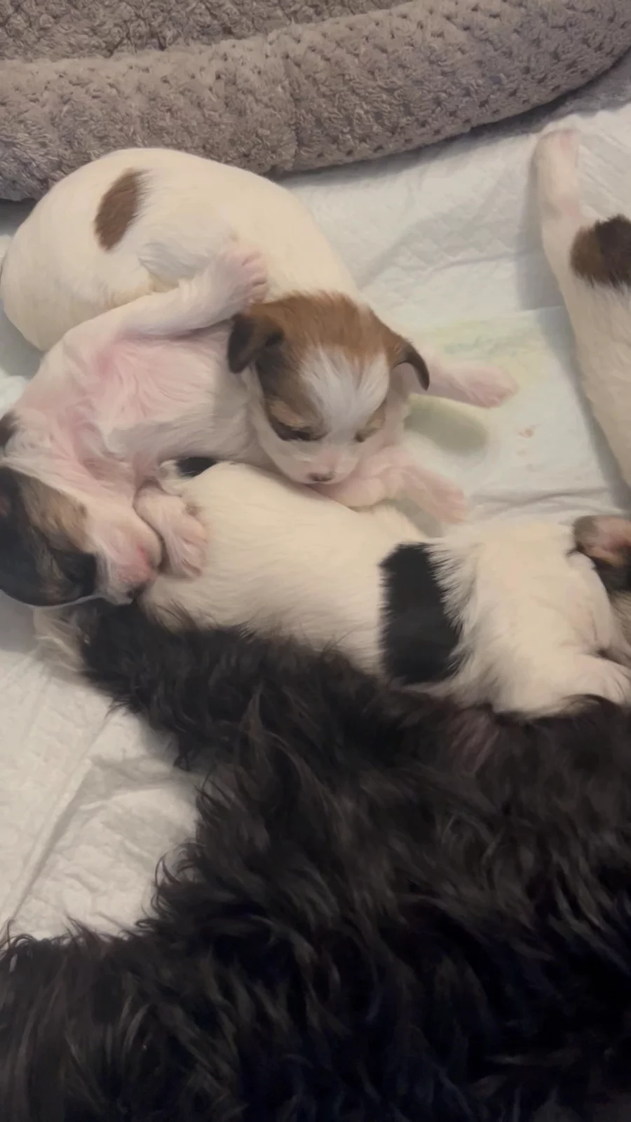 4 weeks old! Weaning has begun with wet food once a day- they don’t mind it but still prefer mama’s milk! Walking, barking, playing, and learning to use their potty pad. They are ADORABLE 🥰
