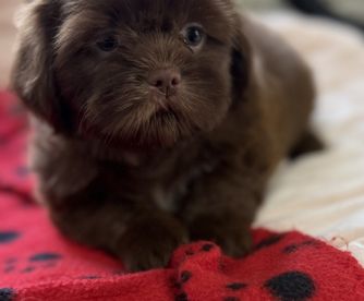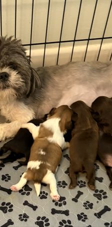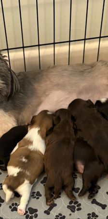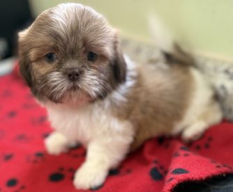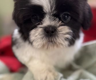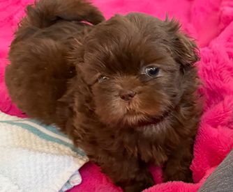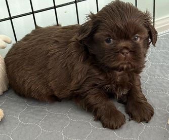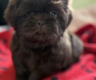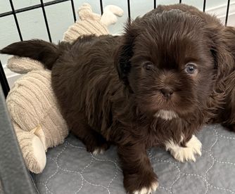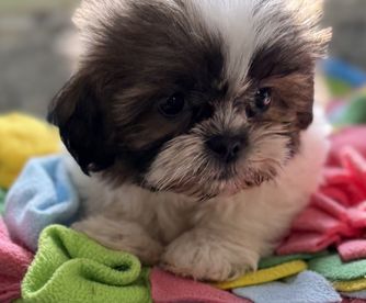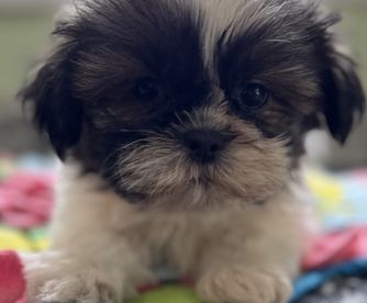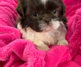 Our Shih Tzu puppies include chocolate, red, and black and white. Maltese puppies are white. Colors will vary depending on the parent dogs.