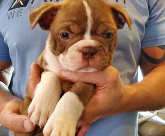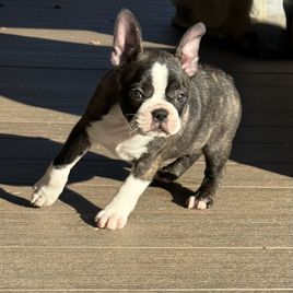 Our puppies include black brindle and white, seal brindle and white, and seal and white. Colors will vary depending on the parent dogs.