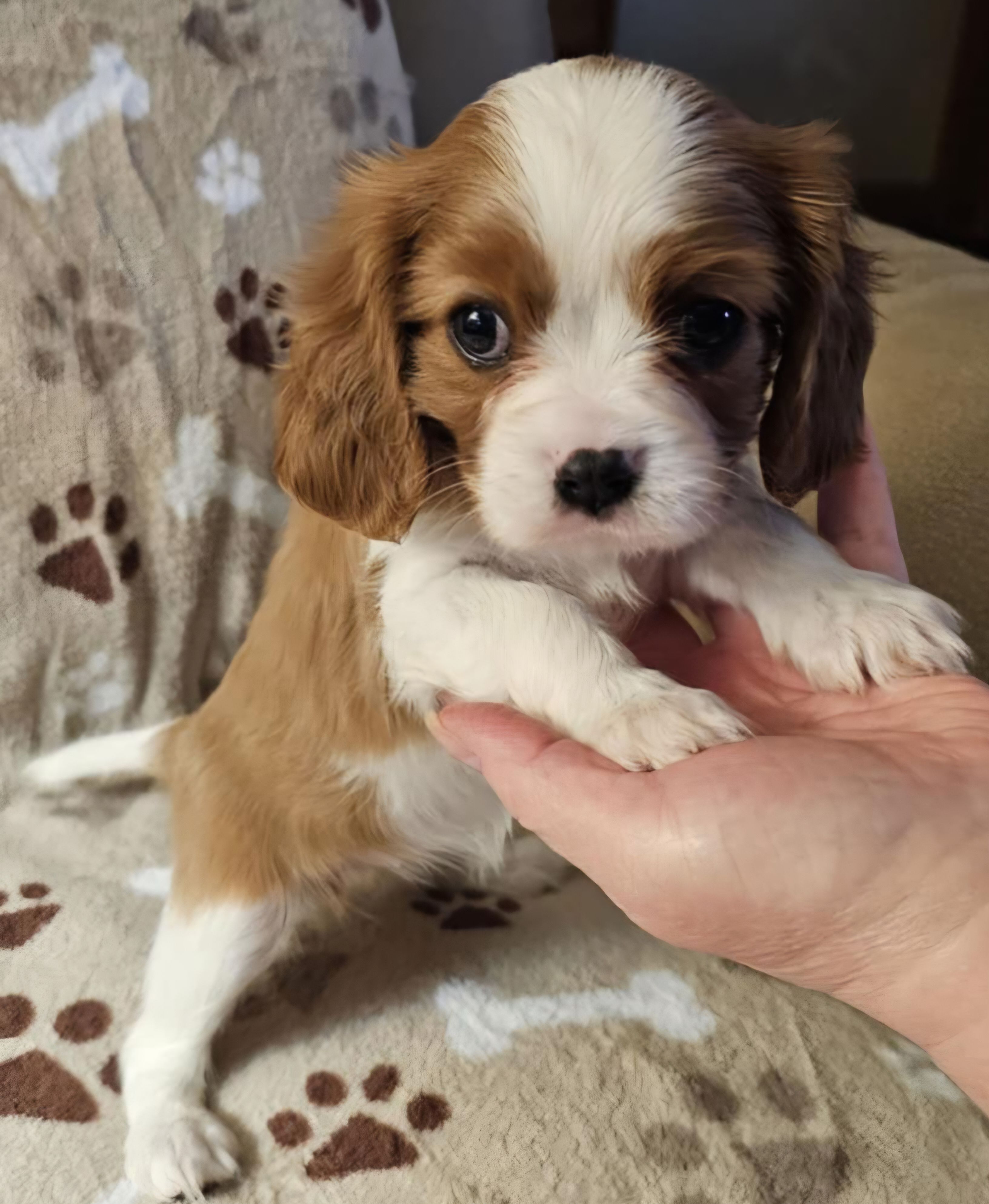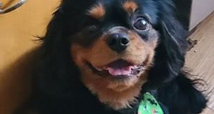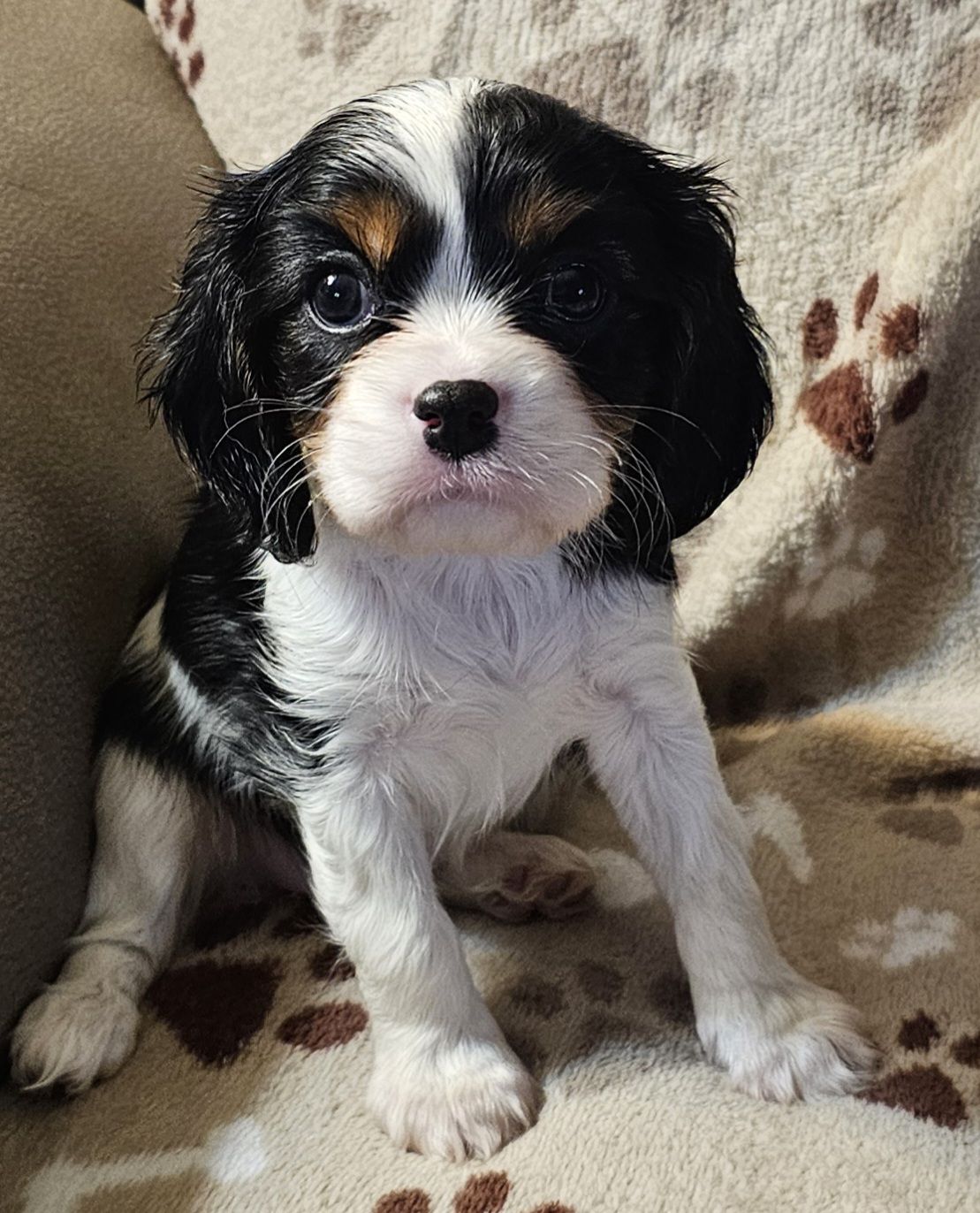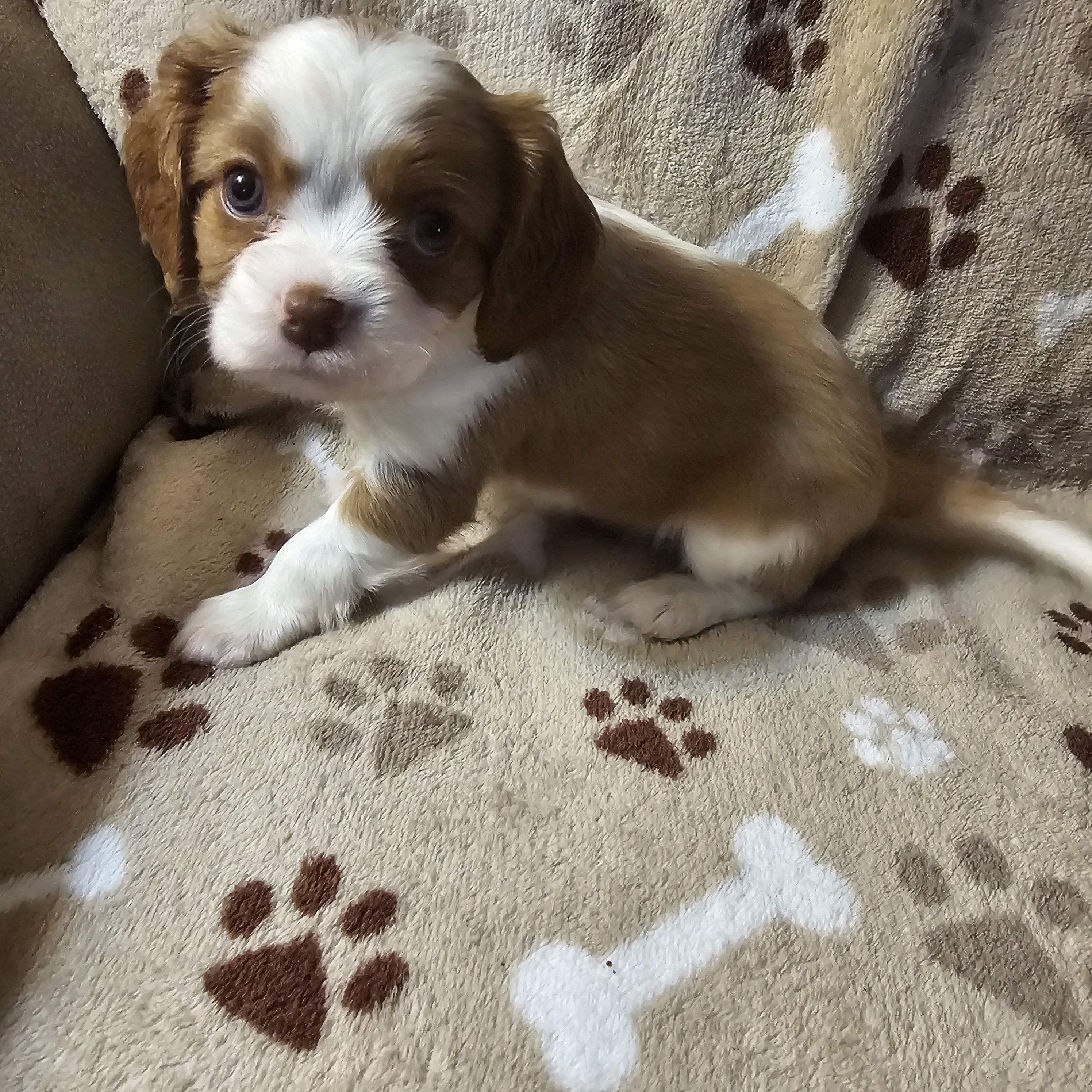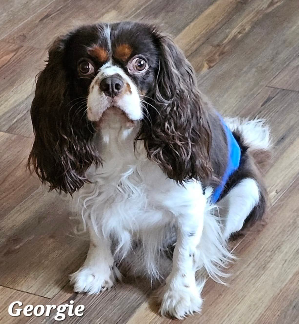 Georgie is a happy-go-lucky, chocolate tri-color Cavalier with a heart as big as his appetite. He greets every day- and every person-with a tail that never stops wagging and eyes that light up at even the slightest hint of a snack. Food-motivated in the most charming way, he'll happily perform his full repertoire of tricks for a single treat, and then ask if you'd like an encore. His goofy, joyful energy makes him the sunshine of any room he enters. Whether he's trotting around with a bounce in his step, snuggling up for attention, or giving his best "I definitely deserve another cookie" puppy-dog eyes, Georgie radiates the kind of pure, uncomplicated happiness that only a truly lovable Cavalier can. He's soft, sweet, endlessly cheerful-and absolutely impossible not to adore.
