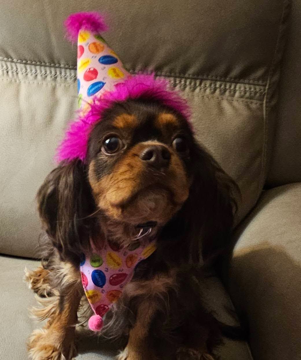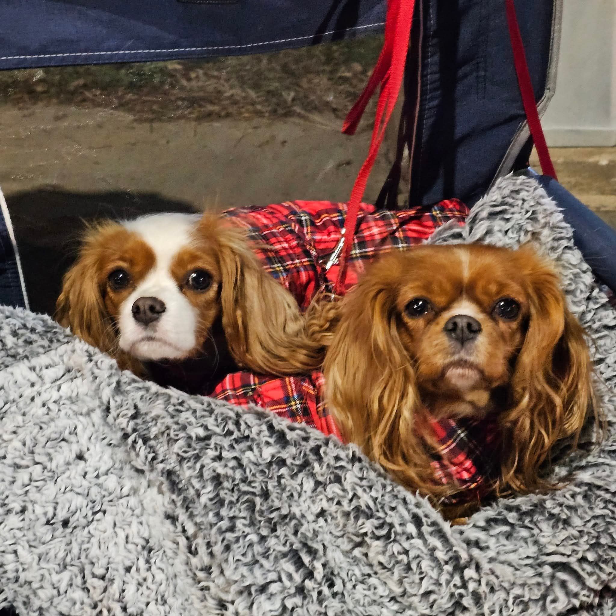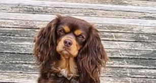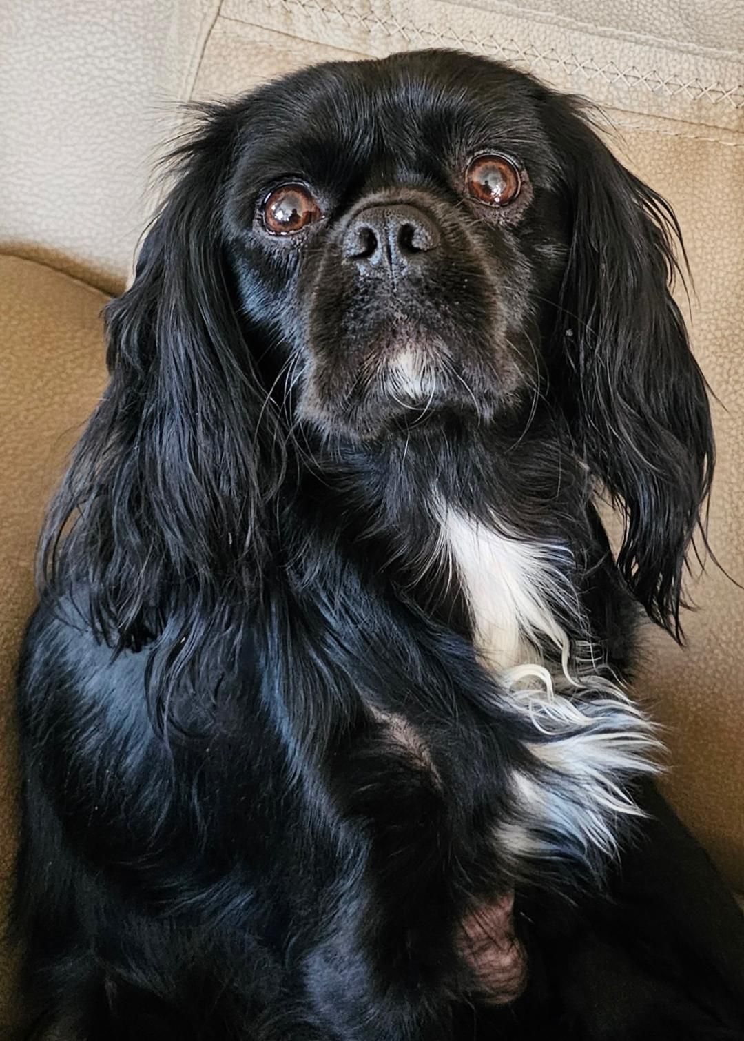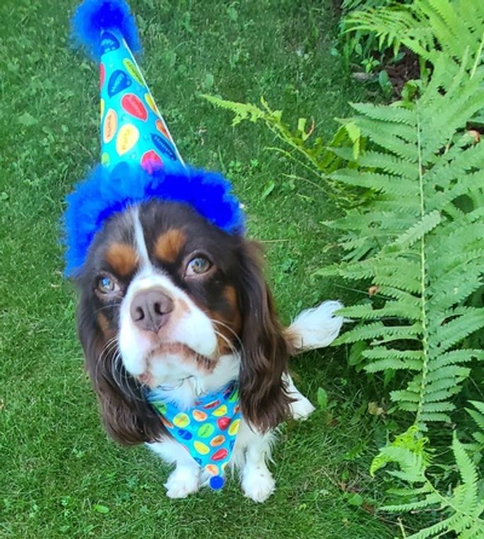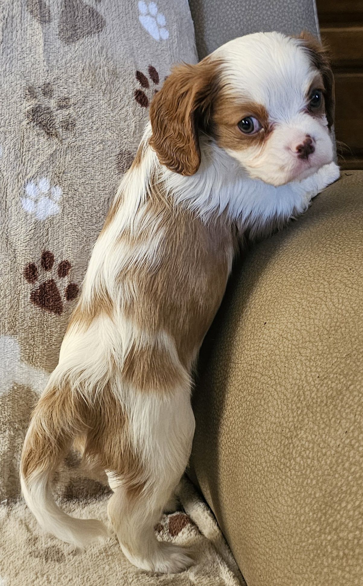 Georgie is a happy-go-lucky, chocolate tri-color Cavalier with a heart as big as his appetite. He greets every day- and every person-with a tail that never stops wagging and eyes that light up at even the slightest hint of a snack. Food-motivated in the most charming way, he'll happily perform his full repertoire of tricks for a single treat, and then ask if you'd like an encore. His goofy, joyful energy makes him the sunshine of any room he enters. Whether he's trotting around with a bounce in his step, snuggling up for attention, or giving his best "I definitely deserve another cookie" puppy-dog eyes, Georgie radiates the kind of pure, uncomplicated happiness that only a truly lovable Cavalier can. He's soft, sweet, endlessly cheerful-and absolutely impossible not to adore.