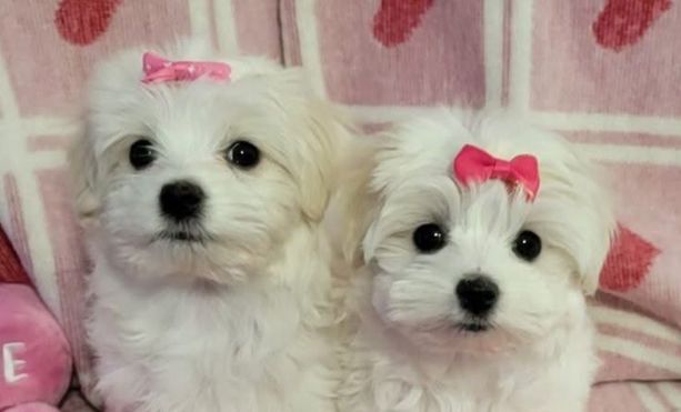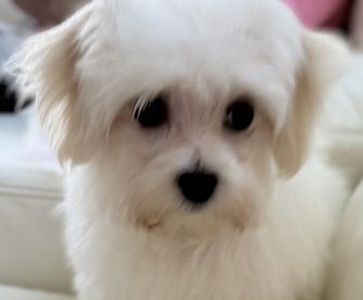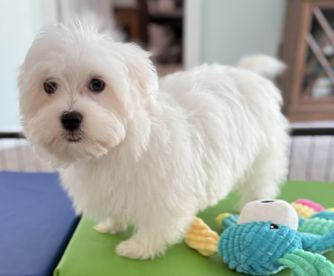 Our Maltese puppies include white and white and lemon. Maltipoo puppies include black & white, apricot, brown, and white. Colors will vary depending on the parent dogs.