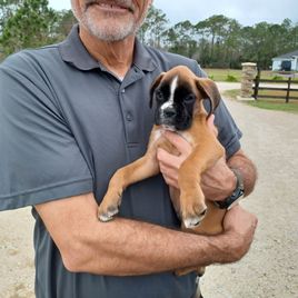 I'm Margaret M., the breeder behind Beachside Boxers and Frenchies located in New Smyrna Beach, FL. We love to responsibly raise and train our puppies so they have the tools to be well-rounded, beloved family members. The loyalty and loving disposition of this breed are simply the best! We put a great deal of effort into raising our litters to ensure our puppy families will have the best experience raising their new family members.