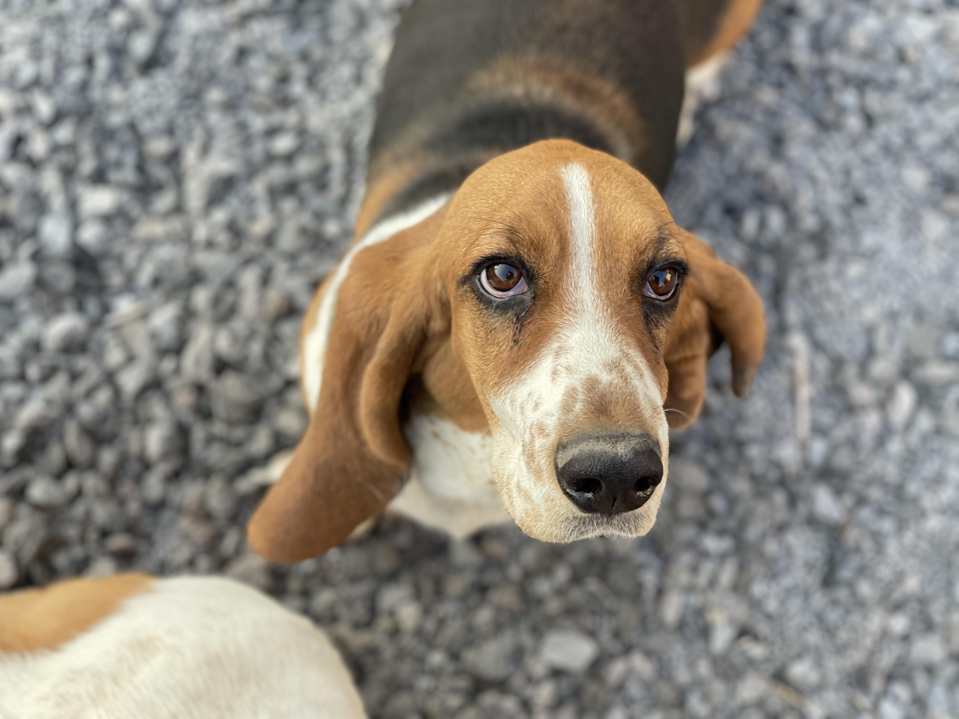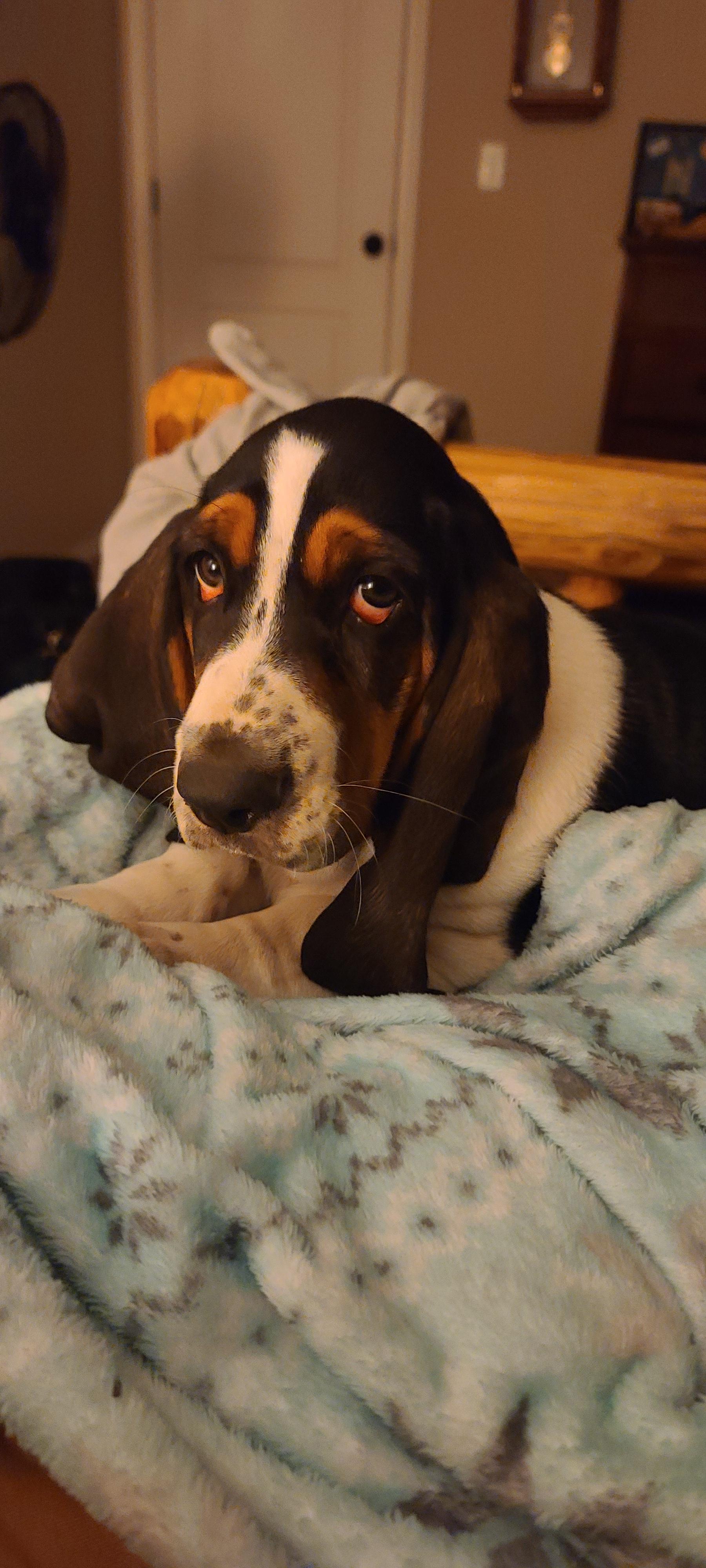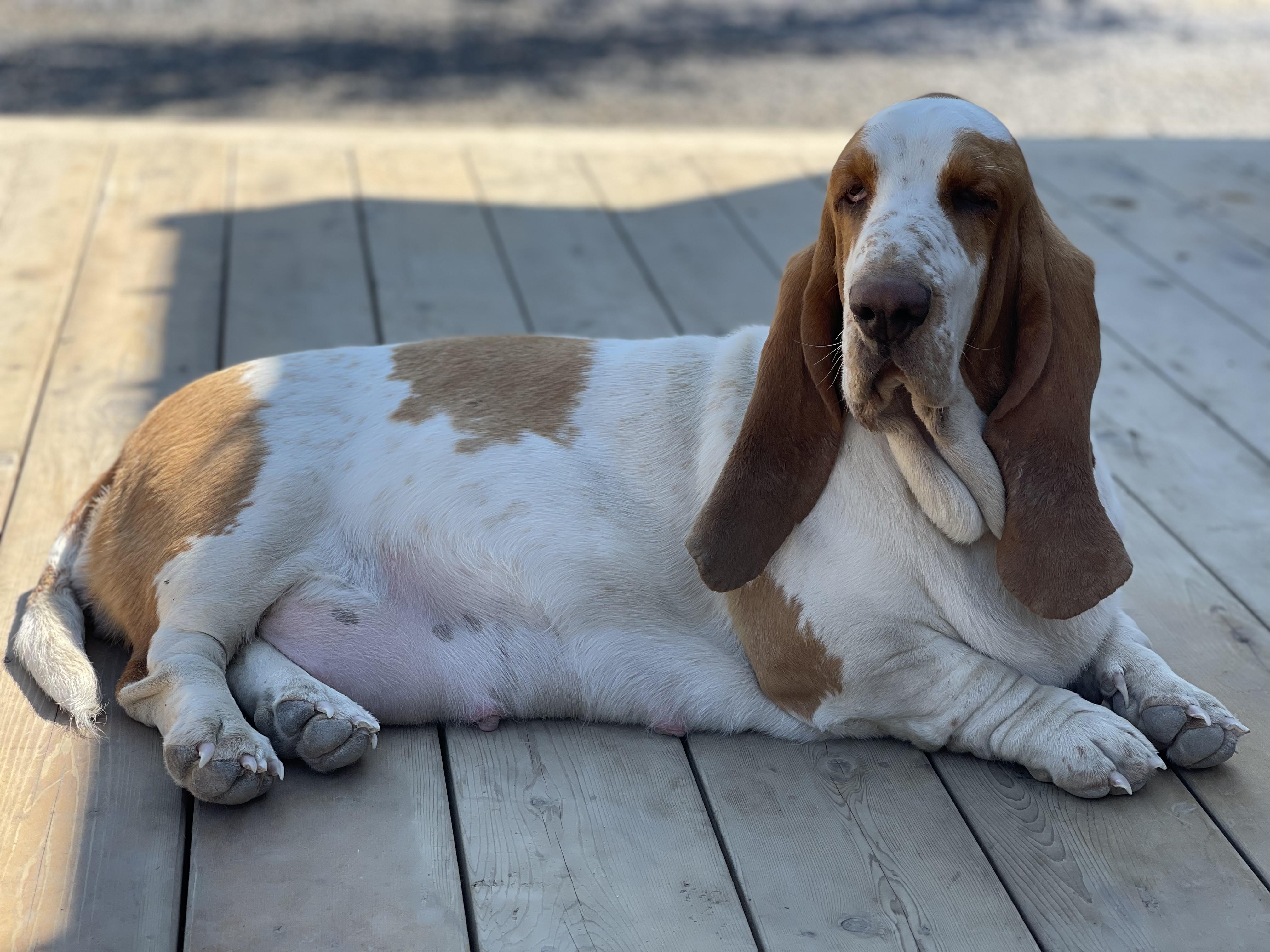 Penny is smaller girl at 45lbs AKC and clear genetic testing. She’s 25% European 75% American Basset. She’s laid-back and is so good with our kids. She sleeps with my 6 year old son every night.