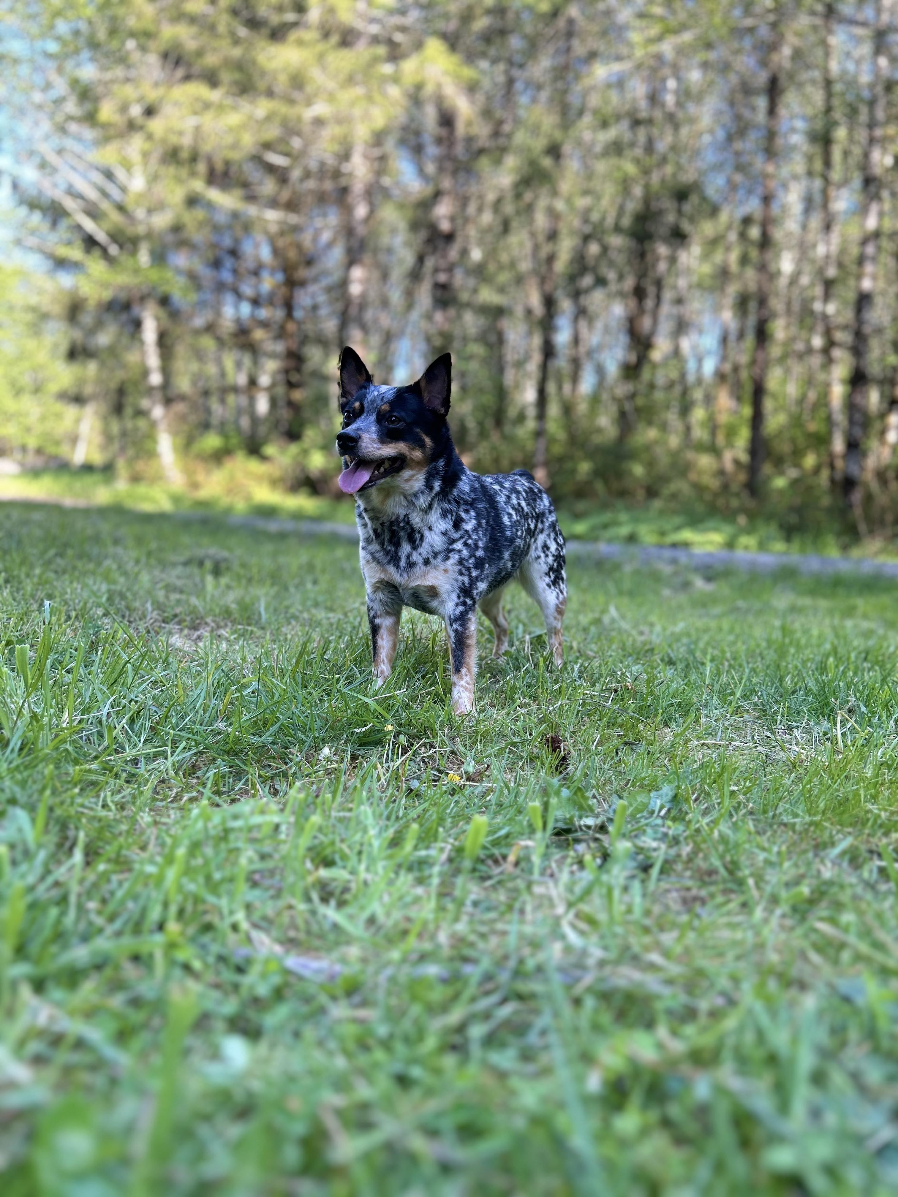 Mini Blue Heeler. Active, loyal, sometimes needy for attention but well mannered.