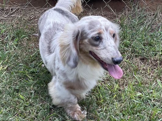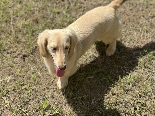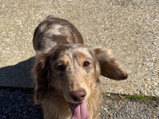 Coco is a long-haired chocolate-based cream. She’s always happy, always wagging, and loves every second she gets to spend with her family and the other dogs.