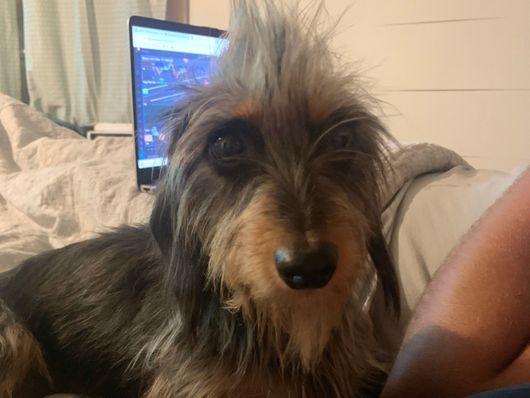 Fiona is a wire haired black and tan. She enjoys laying on the couch, sun bathing on the porch and barking at the ups man.