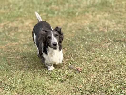 Lola is a silky wire haired black and cream piebald. She is so sweet and too smart for her own good most of the time!