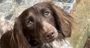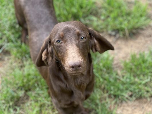 Faith is a great girl. She is a smooth coat, solid chocolate that carries piebald and dilute.