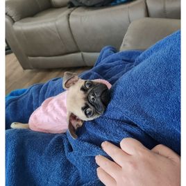 Skye is a female Pug. Carefully selected as a great representative of her breed, Maria decided to make her part of their program. Maria has passed Good Dog’s screening process, which involved a review of their breeding practices, environment, and the mental and physical health of their dogs.