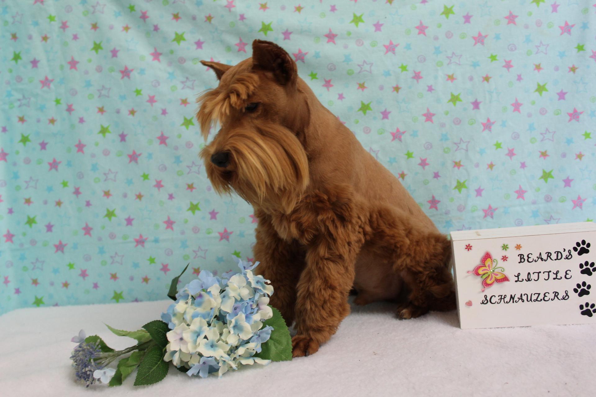 Opie is a beautiful 9 out of ten on red intensity. He is also 100% schnauzer and health clear. he has a beautiful dark red mega coat. and his personality is very friendly and outgoing. He has a very thick square build