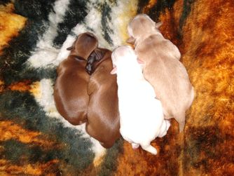 Our puppies include cream and white, chocolate, black, liver, blue, red, liver and white, blue and white, brindle and white, and brindle. Colors will vary depending on the parent dogs.